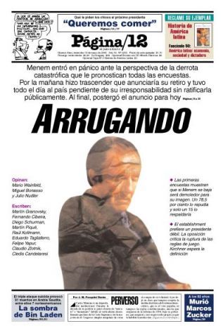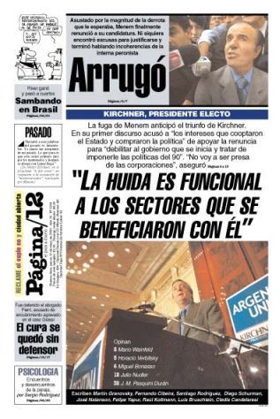 La historia es por todos conocida: ante la inminencia de una derrota apabullante en la segunda vuelta, Menem renunció y dejó que Néstor asumiera prácticamente sin legitimidad, debido al nivel de fragmentación y descreimiento entonces imperante. Los síntomas eran los de un país en descomposición, con protestas en la calle a cada rato, fuerzas policiales que reprimían sin piedad, falta de oportunidades y argentinos y argentinas que se iban a buscarlas cruzando el océano.