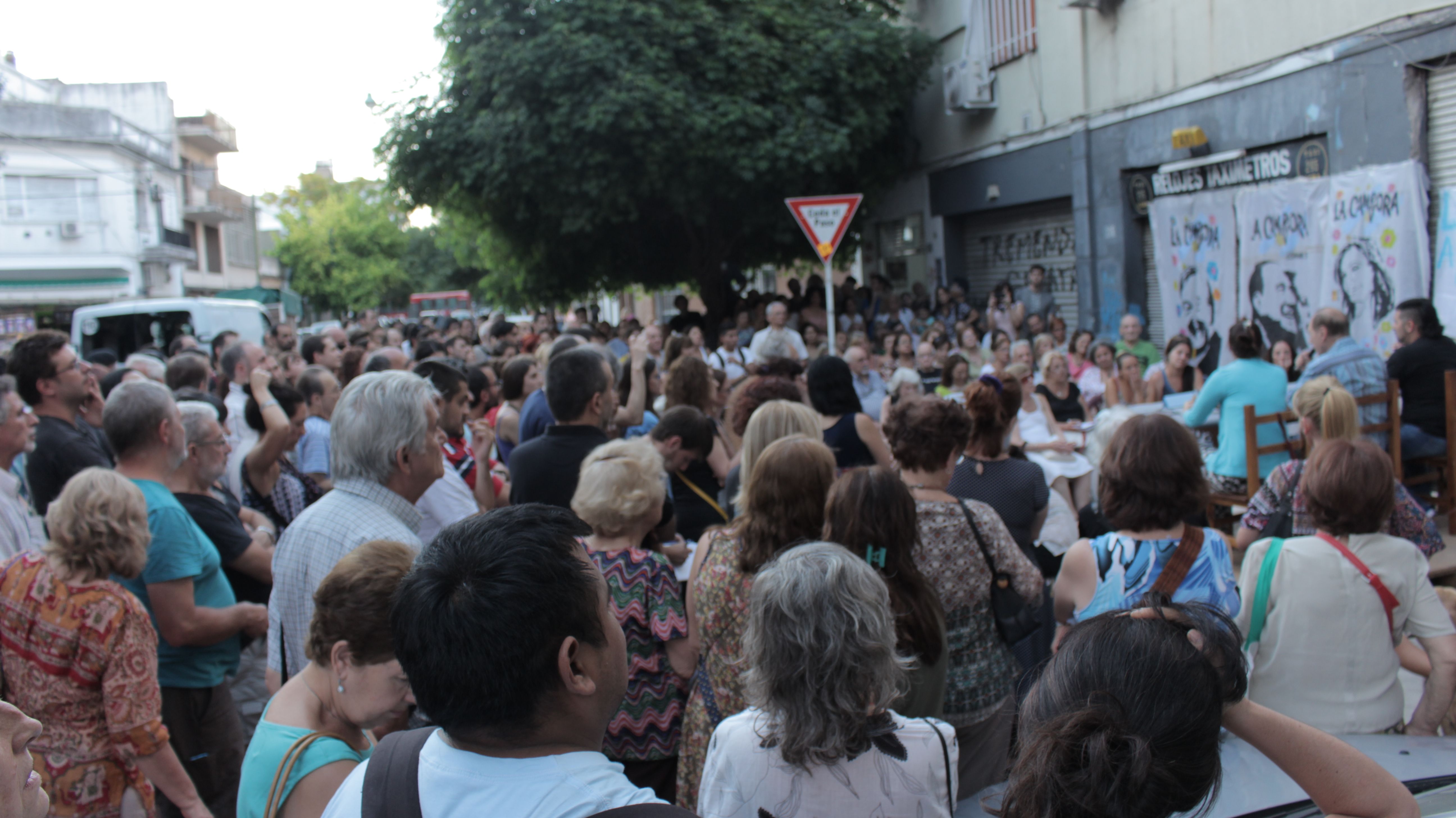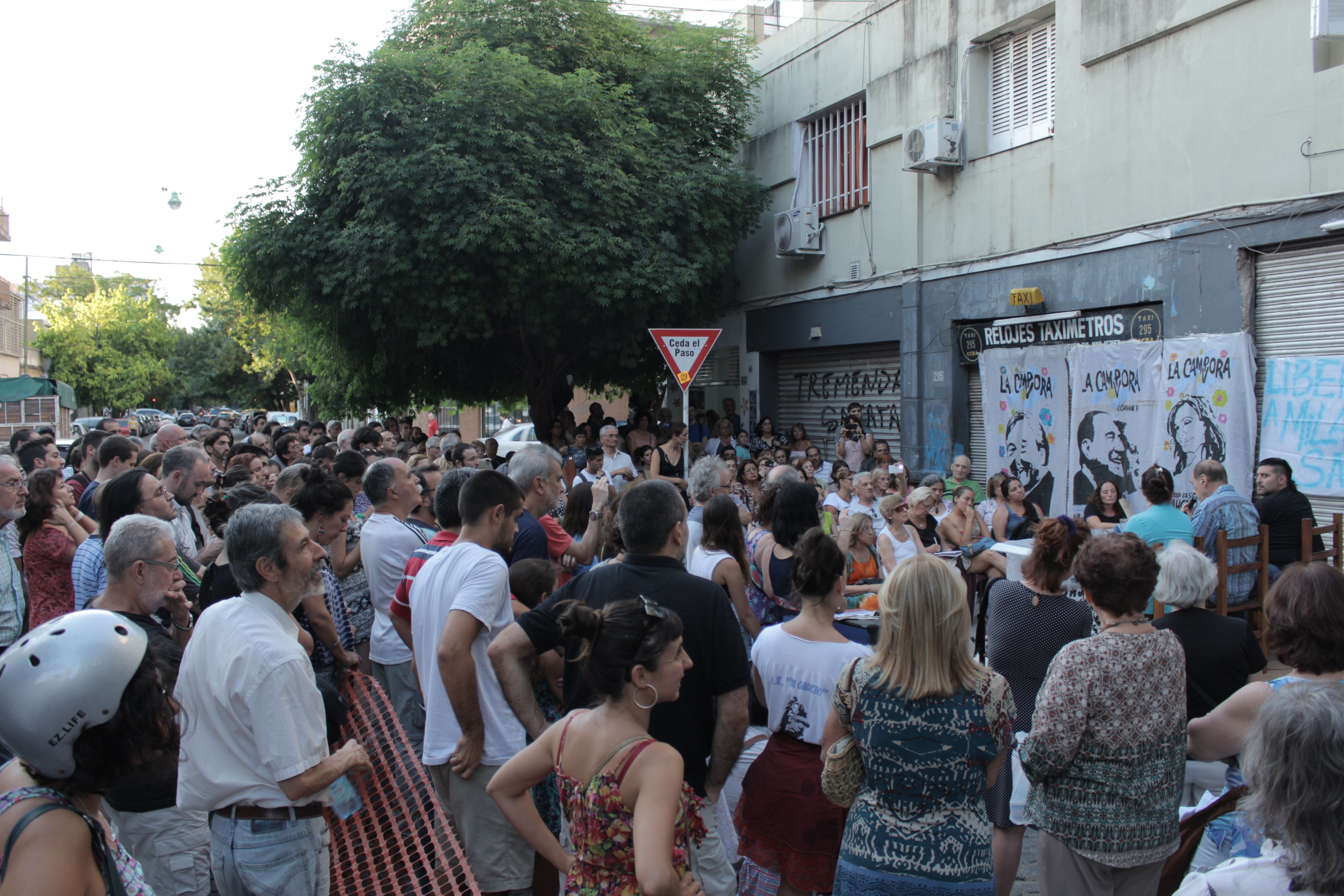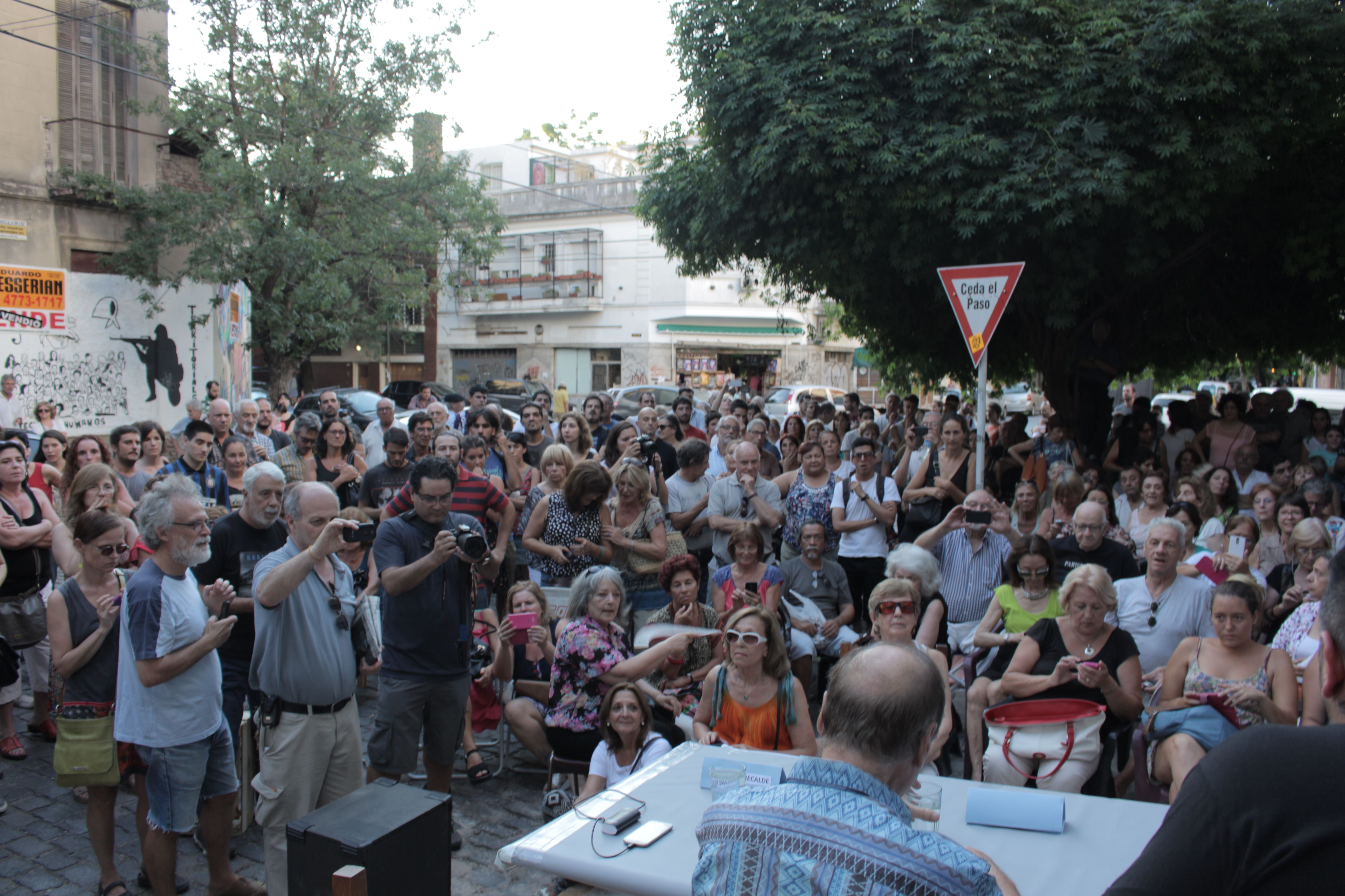 Por un momento, la charla tuvo una pausa ante el paso de un auto desde el que sus pasajeros cantaban “vamos a volver!ˮ, lo que se transmitió al espacio en el que vecinos sentados en reposeras, sillas y cajones de verdura y otros de pie escuchaban atentos a Zaffaroni. El canto al unísono de los asistentes se interrumpió por la voz elevada del jurista, que aclaró: “No vamos a volver porque no nos hemos ido.  ¡Acá estamos!ˮ. Todos estallaron en aplausos.