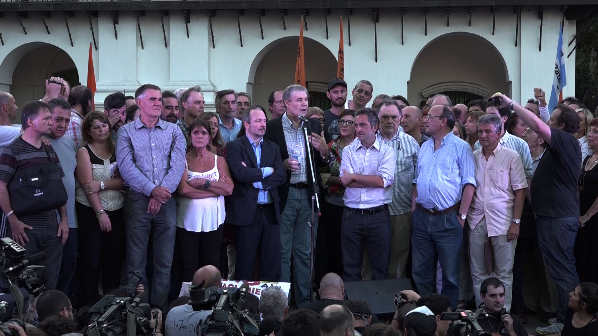 En el escenario dispuesto para la ocasión, Víctor Hugo saludó a los concurrentes al grito de “ ¡Viva la ley de medios!ˮ, mientras junto a él se encontraban Graciana Peñafort y el titular de la Autoridad Federal de Servicios de Comunicación Audiovisual, Martín Sabbatella, a quien pocas horas antes la Policía Federal de Mauricio Macri le denegó el acceso al organismo tras el fallo de la Justicia que lo repuso en su cargo. “Martín está peleando por un derecho de todos ustedes. ¿No parece un cuento que luego de seis años no se haya podido aplicar una ley discutida en todo el país?ˮ, sostuvo Víctor Hugo mientras el público respondía con cantos sobre el principal impulsor de la derogación de la Ley de Servicios de Comunicación Audiovisual, el Grupo Clarín.