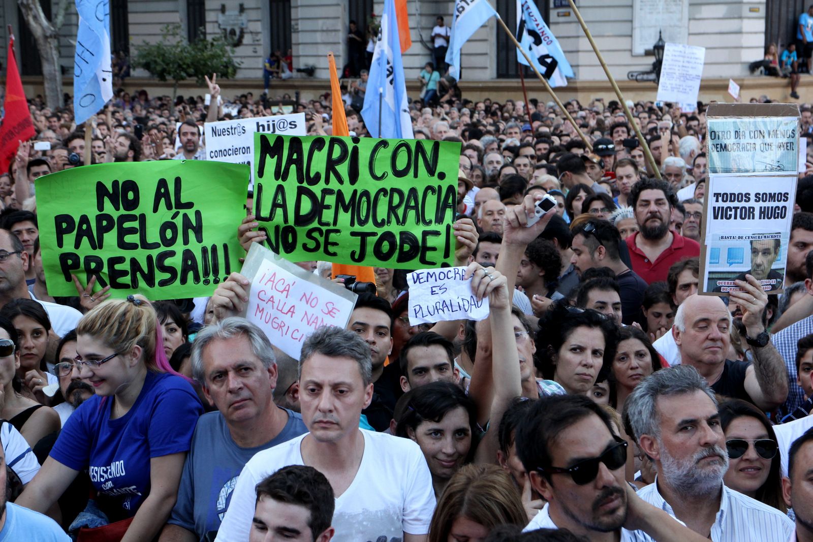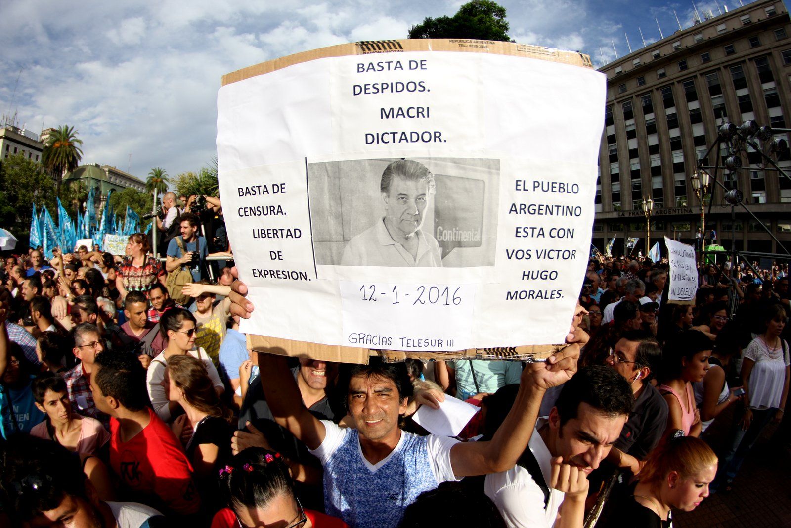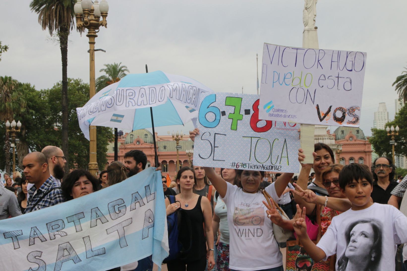 Una multitud acompañó ayer al periodista Víctor Hugo Morales en Plaza de Mayo, un día después de que fuera despedido de su programa en radio Continental por el Grupo Prisa, luego de treinta años de trabajo. La convocatoria para repudiar el acto de censura que cometió la empresa, que en noviembre del año pasado le había renovado el contrato por un año más, surgió a través de las redes sociales por distintos grupos preocupados por el estado de la libertad de expresión en el país. Al despido injustificado de Víctor Hugo Morales se suma el levantamiento de otras voces disonantes al relato del gobierno, como el programa 678 o la programación entera de la FM Nacional Rock.