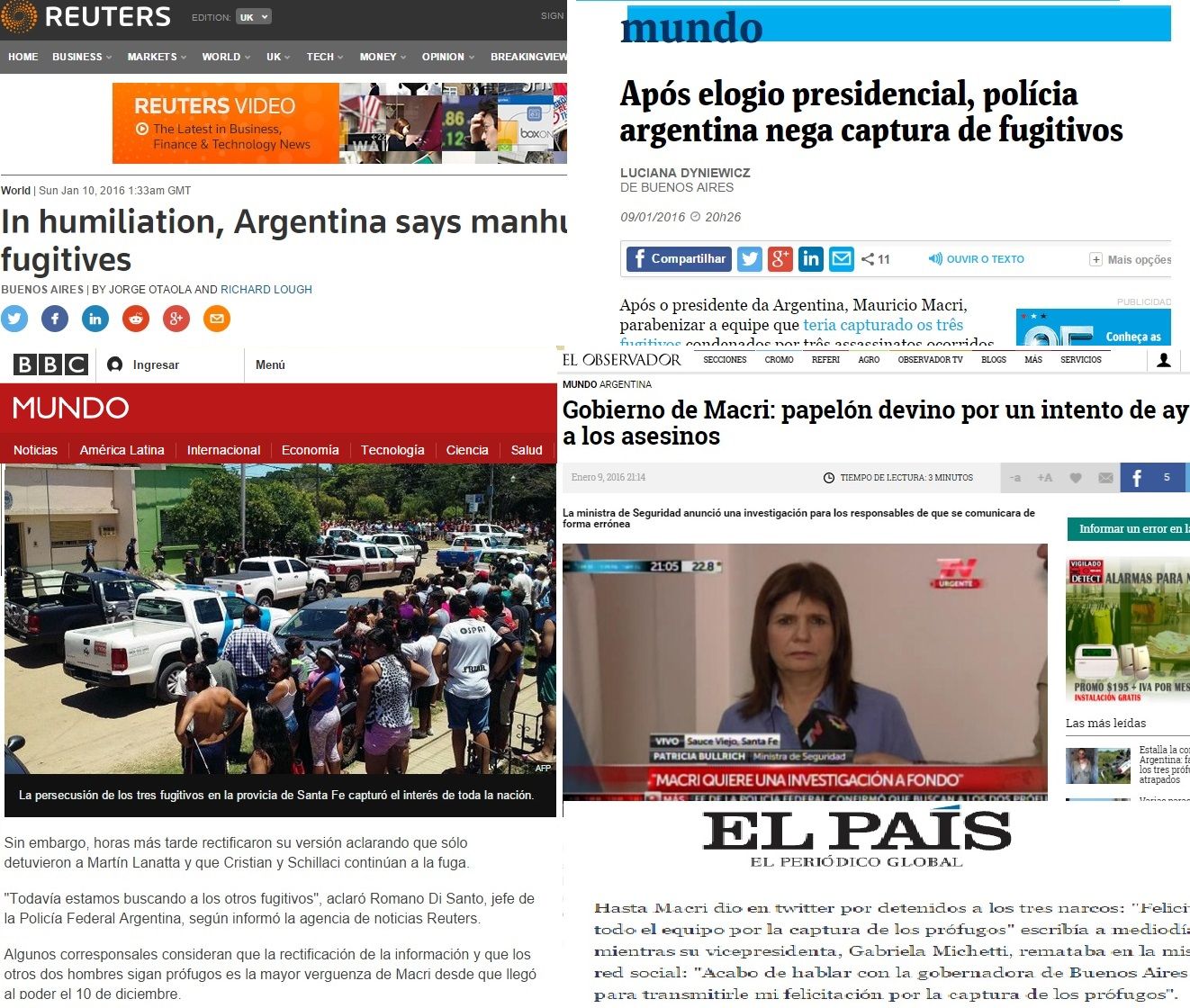 En su portal en inglés, la agencia Reuters comenzó la crónica del día de día de ayer afirmando que "el presidente Mauricio Macri fue humillado este sábado después de que el jefe de la policía federal de Argentina admitiera que continuaba la cacería de dos de los criminales más notorios de ese país sudamericano, horas después de que el gobierno celebraron su captura".
