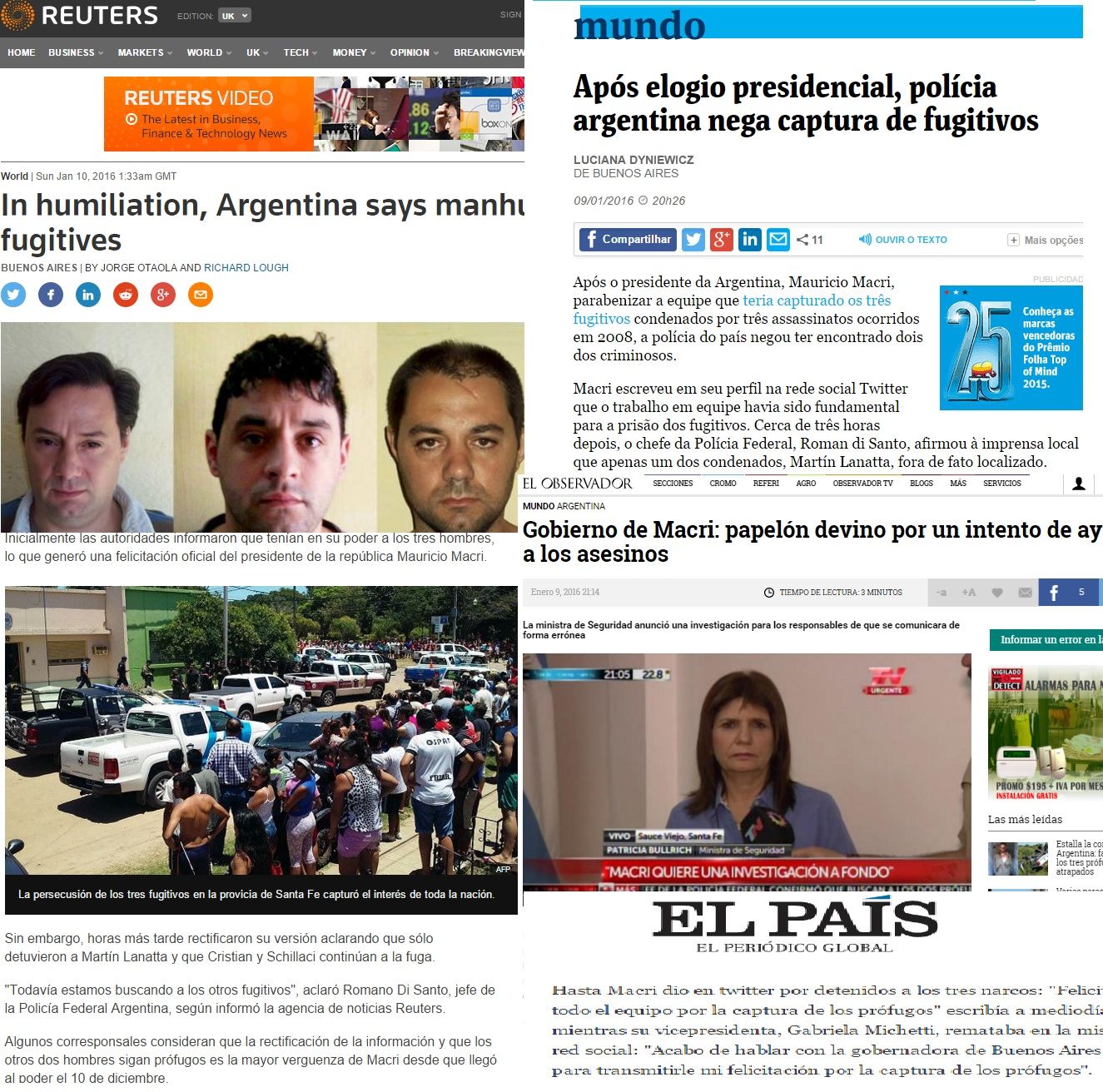 En tanto, El Observador de Montevideo tituló que para el gobierno de Macri "el papelón devino por un intento de ayudar a los asesinos", luego de que la ministra de Seguridad de la Nación, Patricia Bulrrich, denunciara que les sembraron una serie de "pistas falsas" que los llevaron "a informar erróneamente que habían sido capturados los tres narcotraficantes prófugos".