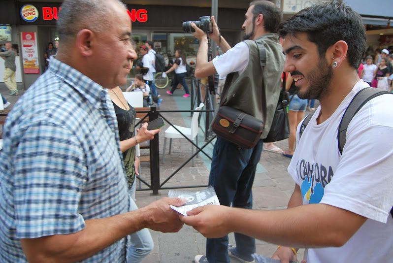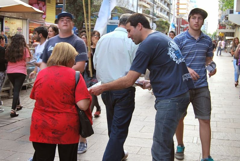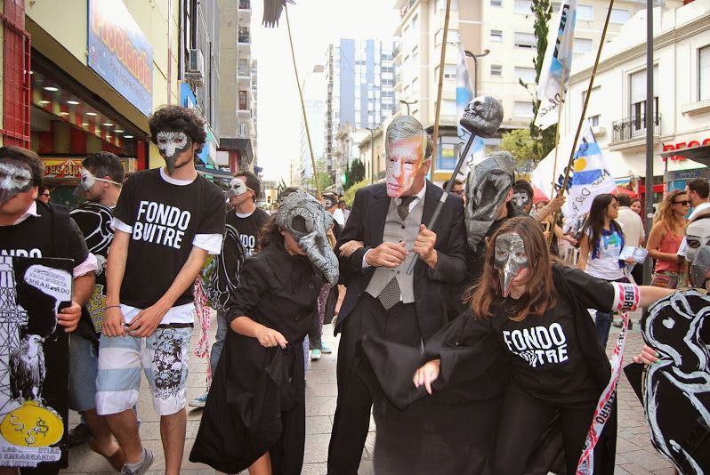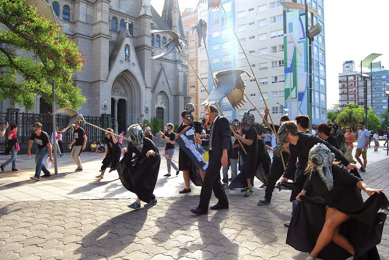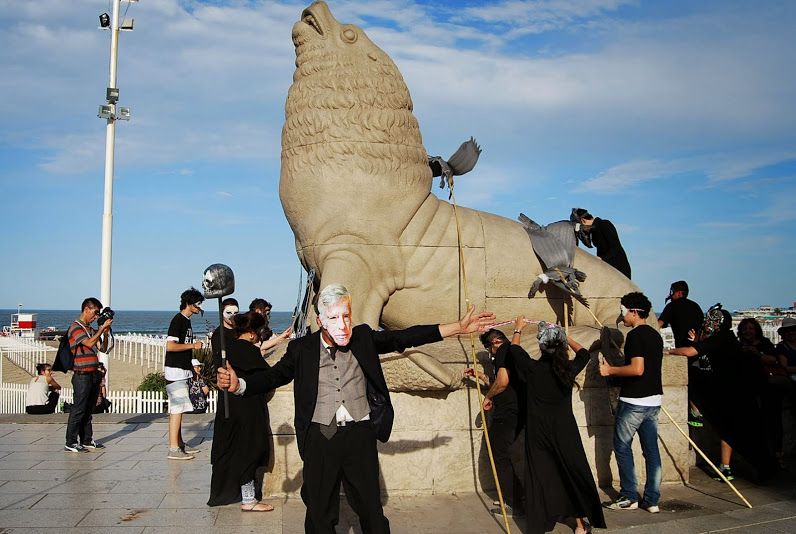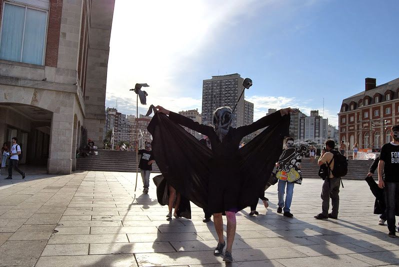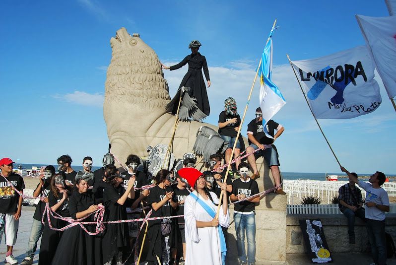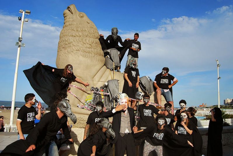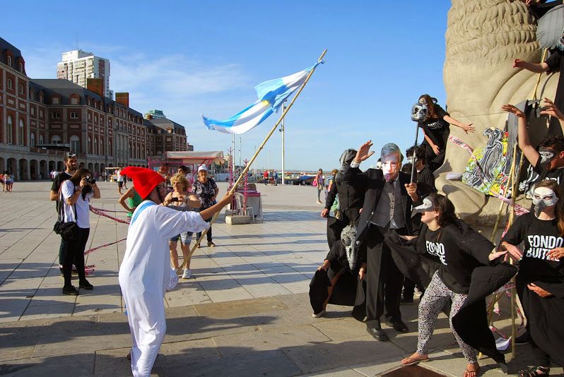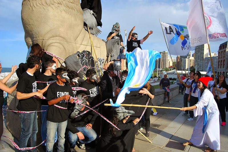 Los compañeros caracterizados como buitres, recorrieron la peatonal de la ciudad, mientras que repartían volantes donde se explicaba la situación de la Argentina y los fondos buitres y conversaban con la gente que se encontraba allí, quienes recibían con alegría los volantes y disfrutaba de la intervención. Luego de varias cuadras, llegaron a la rambla de la ciudad y simularon el embargo del lobo marino bajo las órdenes del juez Griesa. Los fondos buitre quisieron quedarse también con ese ícono de la ciudad. Pero minutos más tarde, otros compañeros bailaron al ritmo de danzas típicas argentinas, enfrentando a los fondos buitres y evitando así el embargo del lobo. Mientras tanto, la bandera de nuestro país flameaba. Los compañeros, mediante la intervención artística, demostraron que la soberanía del país es innegociable y que nadie podrá arrebatarnos nuestros símbolos, nuestras conquistas como Pueblo argentino, nuestros derechos y nuestros sueños, siempre apoyando a Cristina Fernández de Krichner, quien todos los días demuestra su compromiso con la Patria y con todos los argentinos.