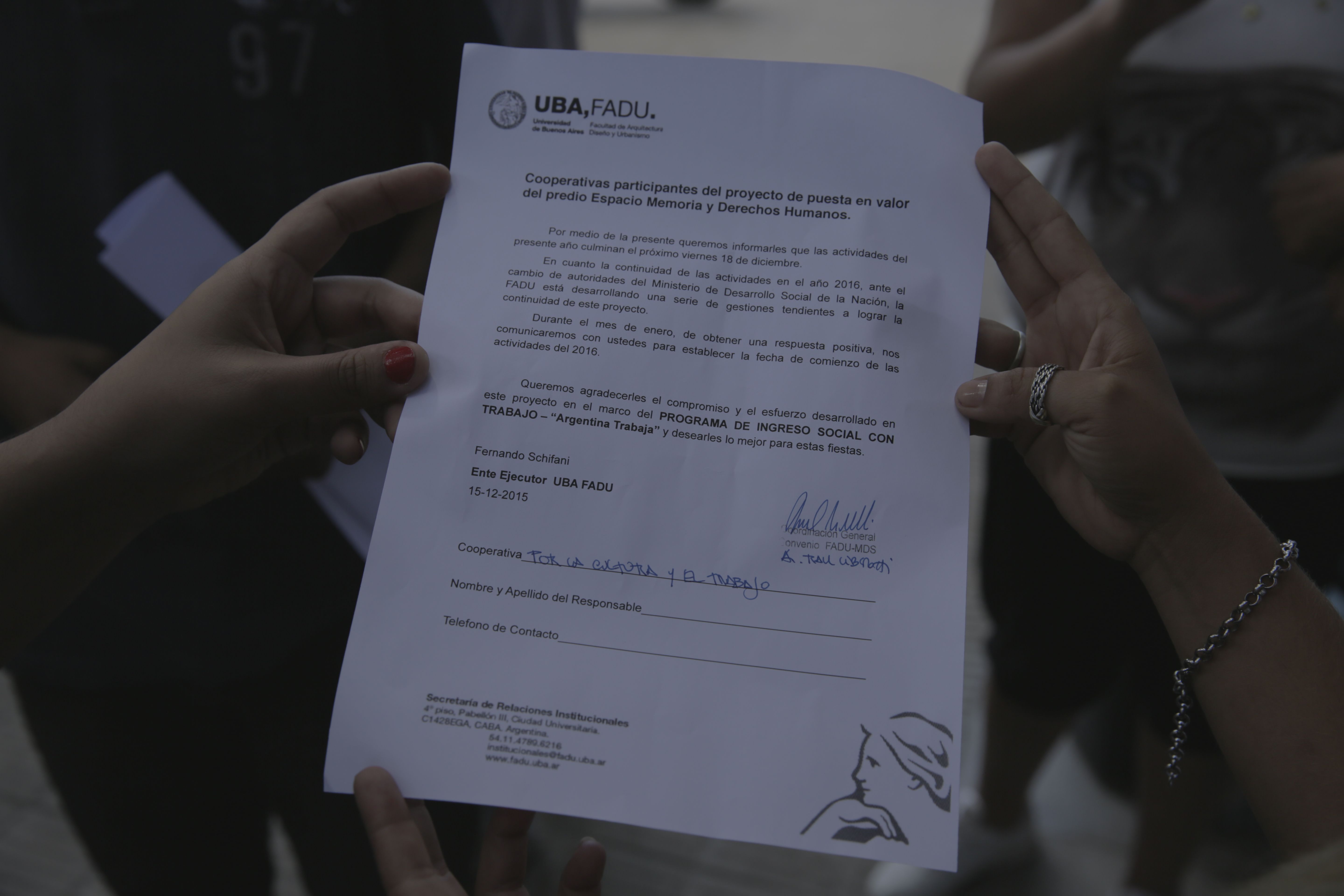Los cooperativistas ˮ“ en un 70 por ciento mujeres- que durante años han acondicionado, construido y mantenido los edificios del predio de la ex Esma, ubicado en Av. Libertador 8151, recibieron la noticia por una notificación cursada por el Ente Ejecutor FADU. Por la tarde hicieron pública la notificación recibida, la cual informa que "ante el cambio de autoridad de gestión, se están desarrollando una serie de gestiones", sin presentar novedad o indicios de dar marcha atrás con la repentina medida.