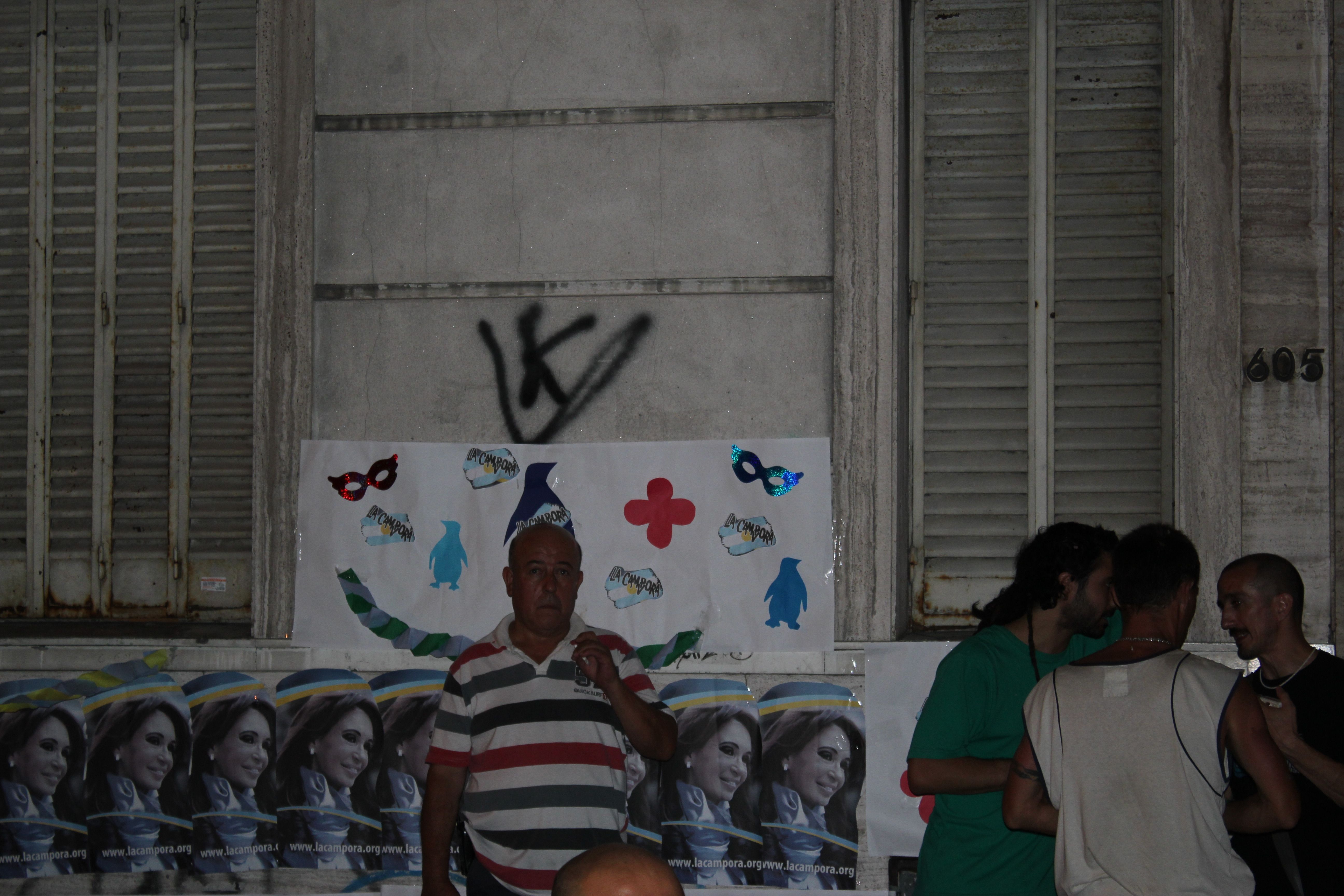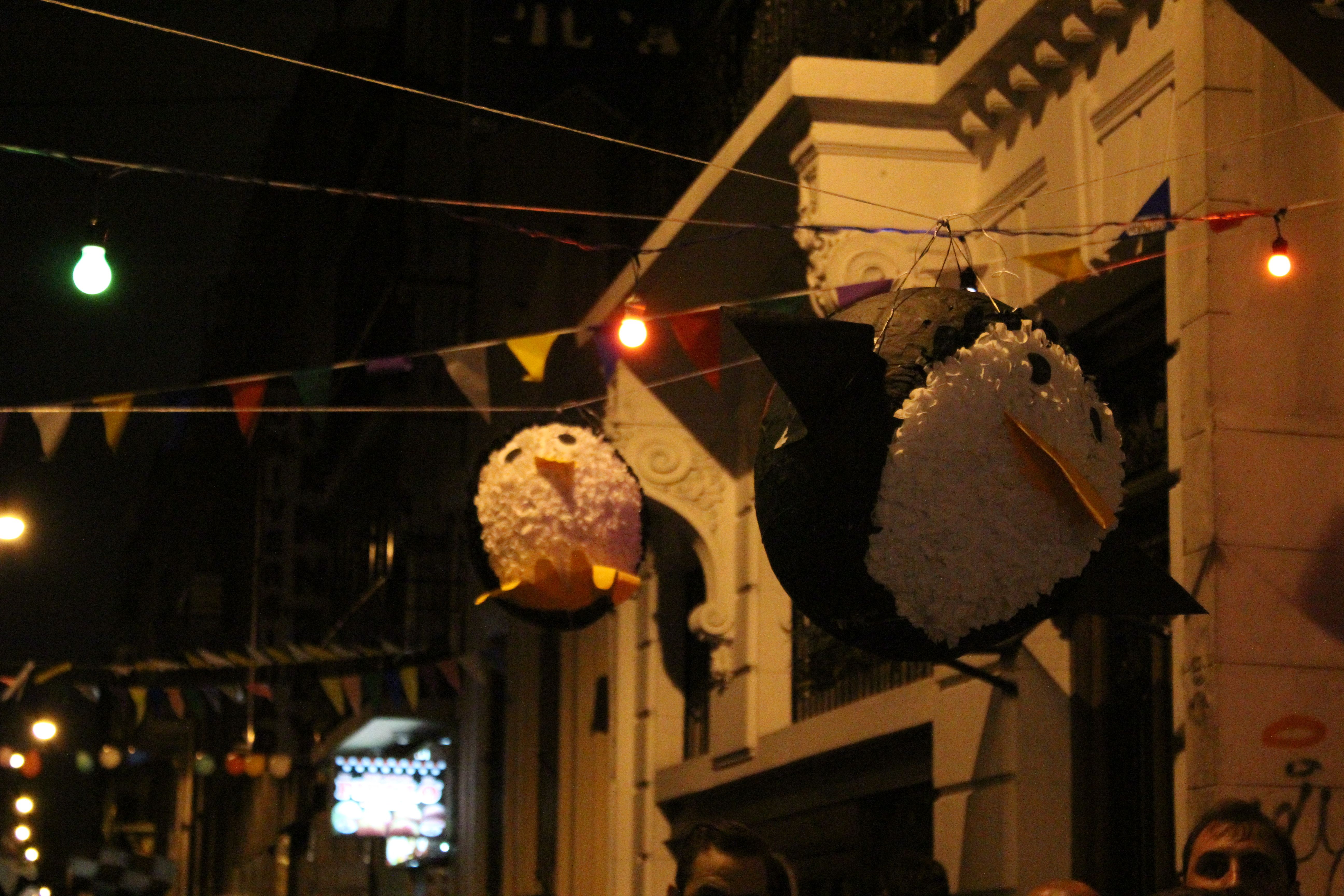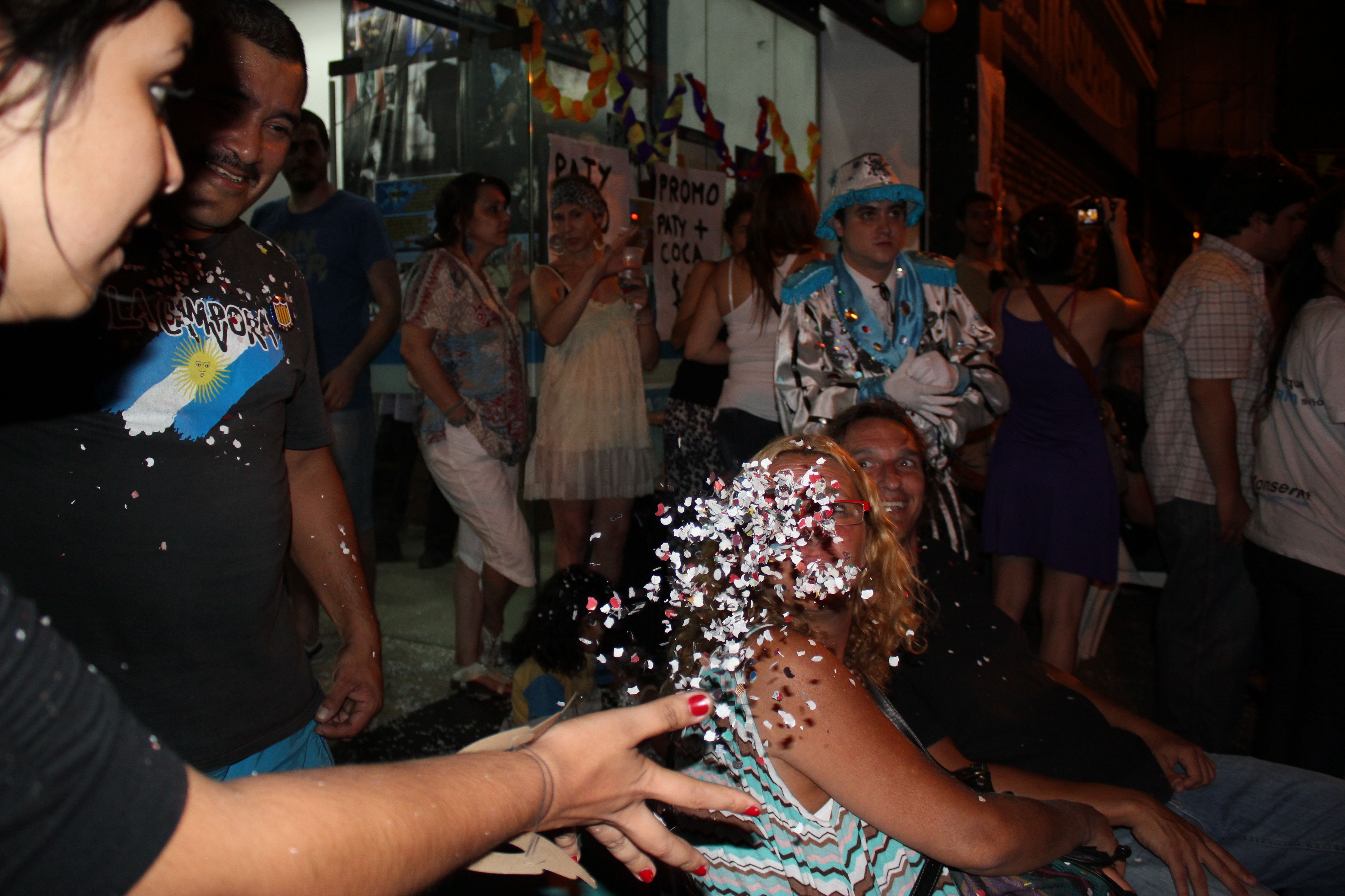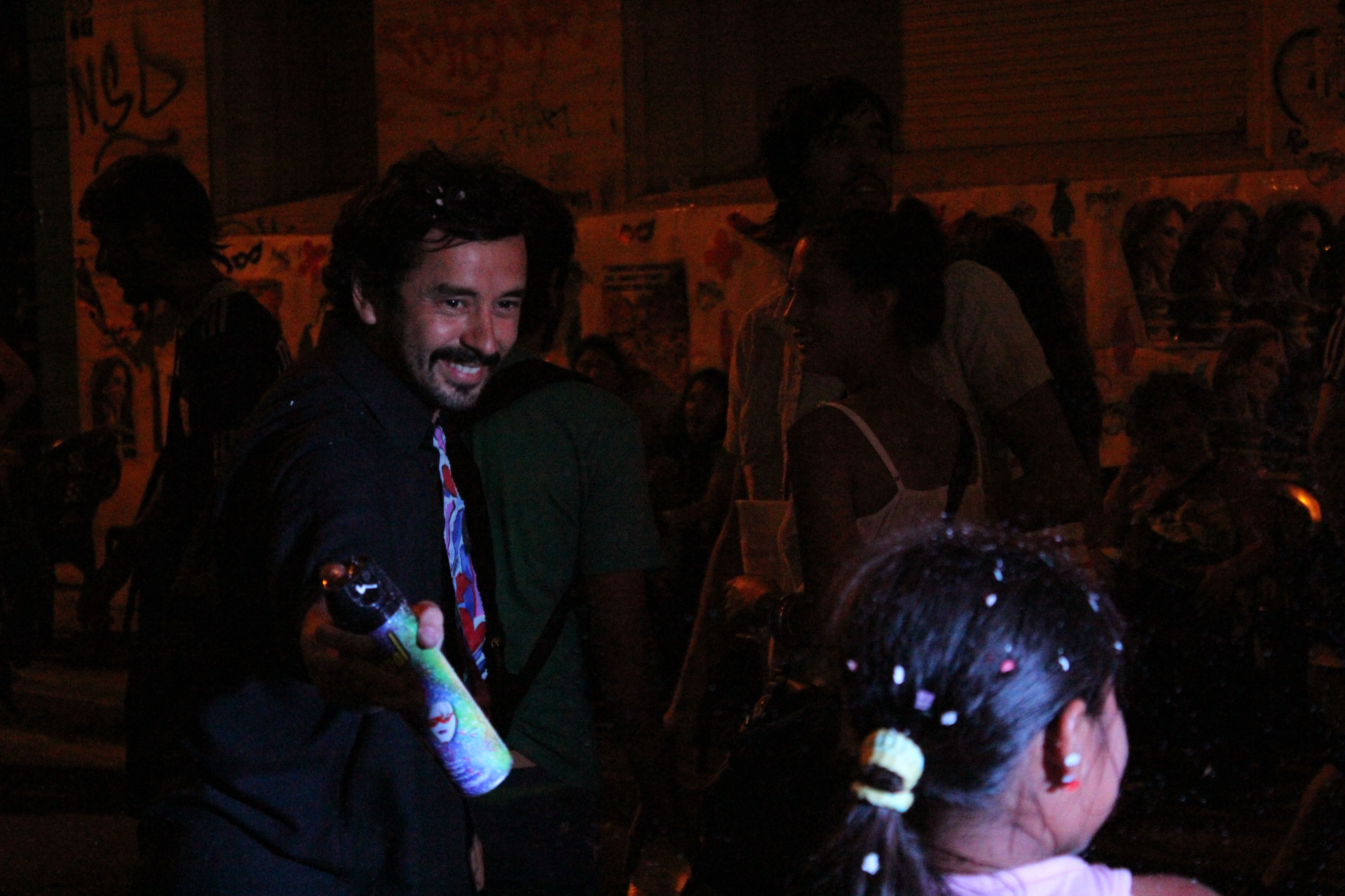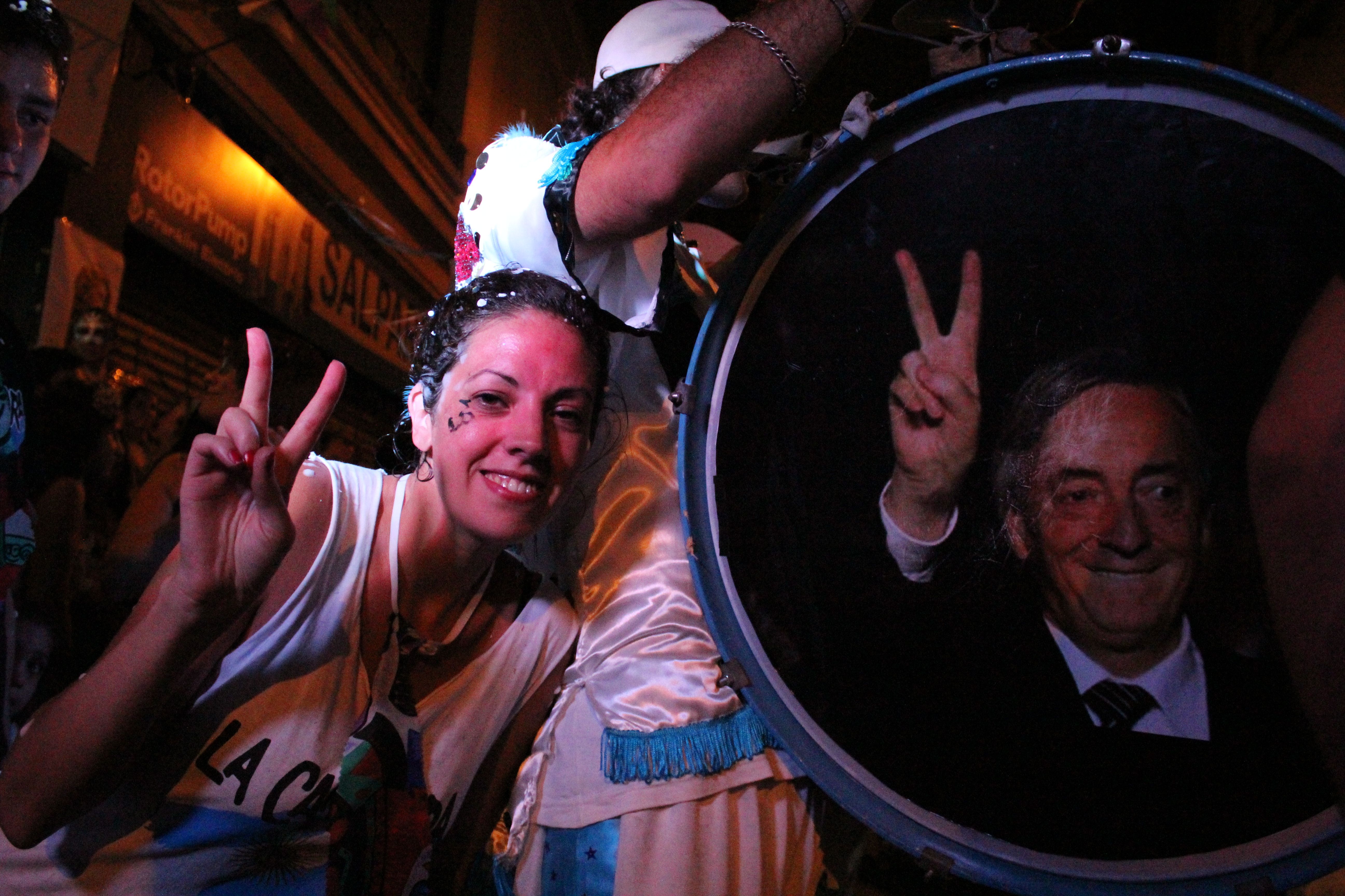 De la espuma y del papel picado no pudo eludirse nadie, ni los grandes ni los niños. Los que quisieron se maquillaron, se pusieron las máscaras típicas de la fecha o se disfrazaron con coloridas corbatas. Los más chicos jugaron incansablemente en los castillos inflables que fueron desplegados en plena cuadra y habían sido decorados para la ocasión. Al mirar al cielo se podían observar piñatas de pingí¼inos hechas a mano por los militantes, una línea de tiempo fotográfica que recorría distintos festejos de carnaval a lo largo de la historia y, en los banderines callejeros, irradiaba el rostro de la compañera coraje iluminada por numerosas luces multicolores.