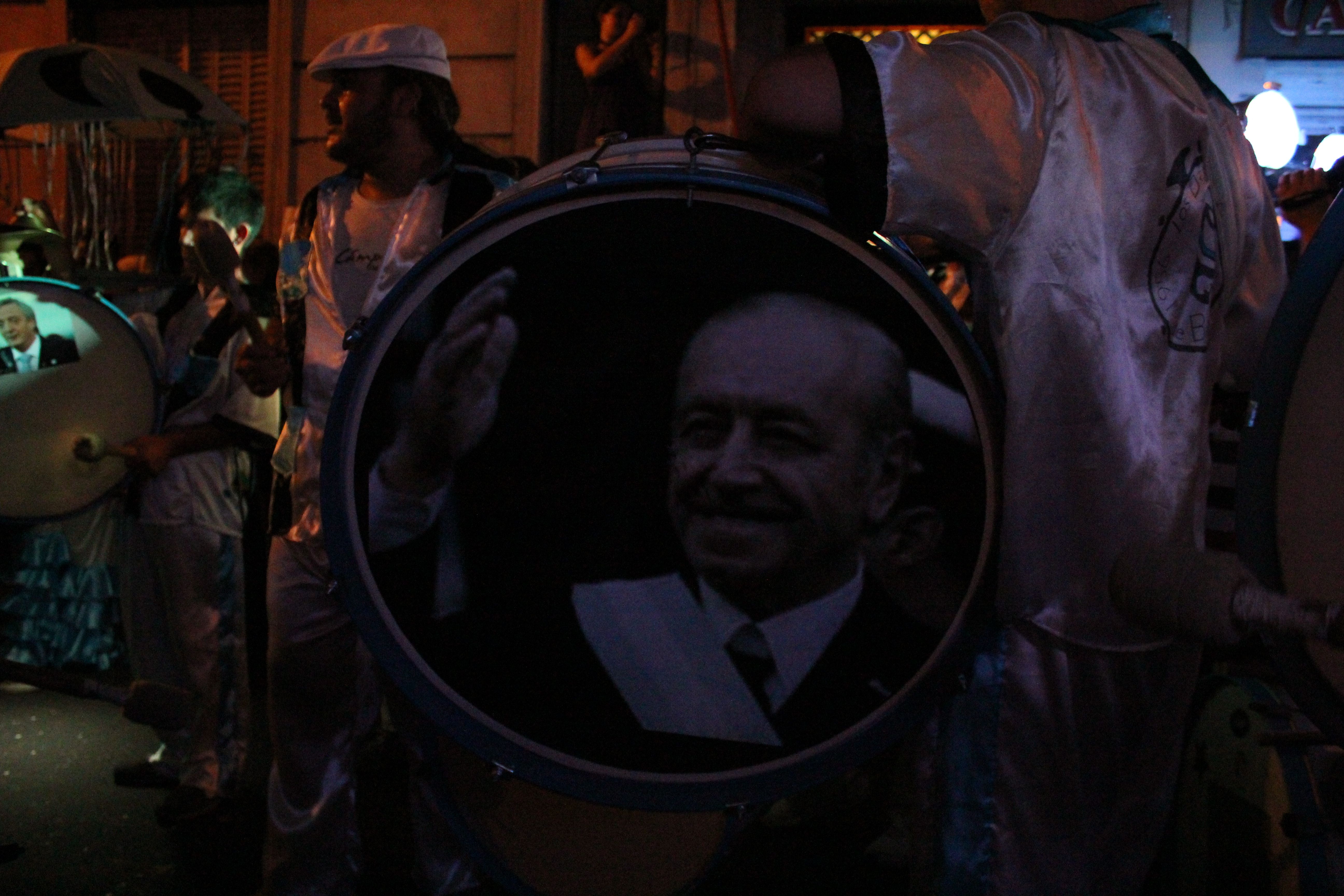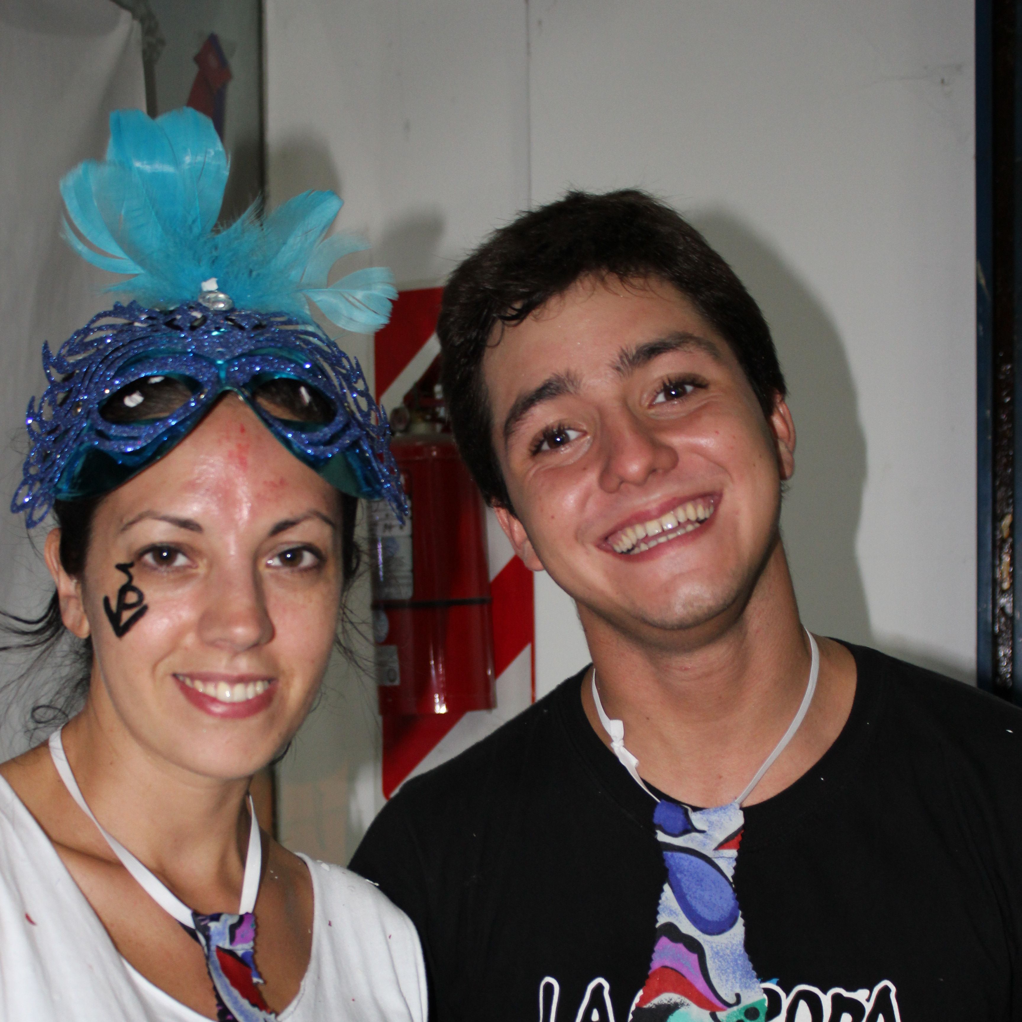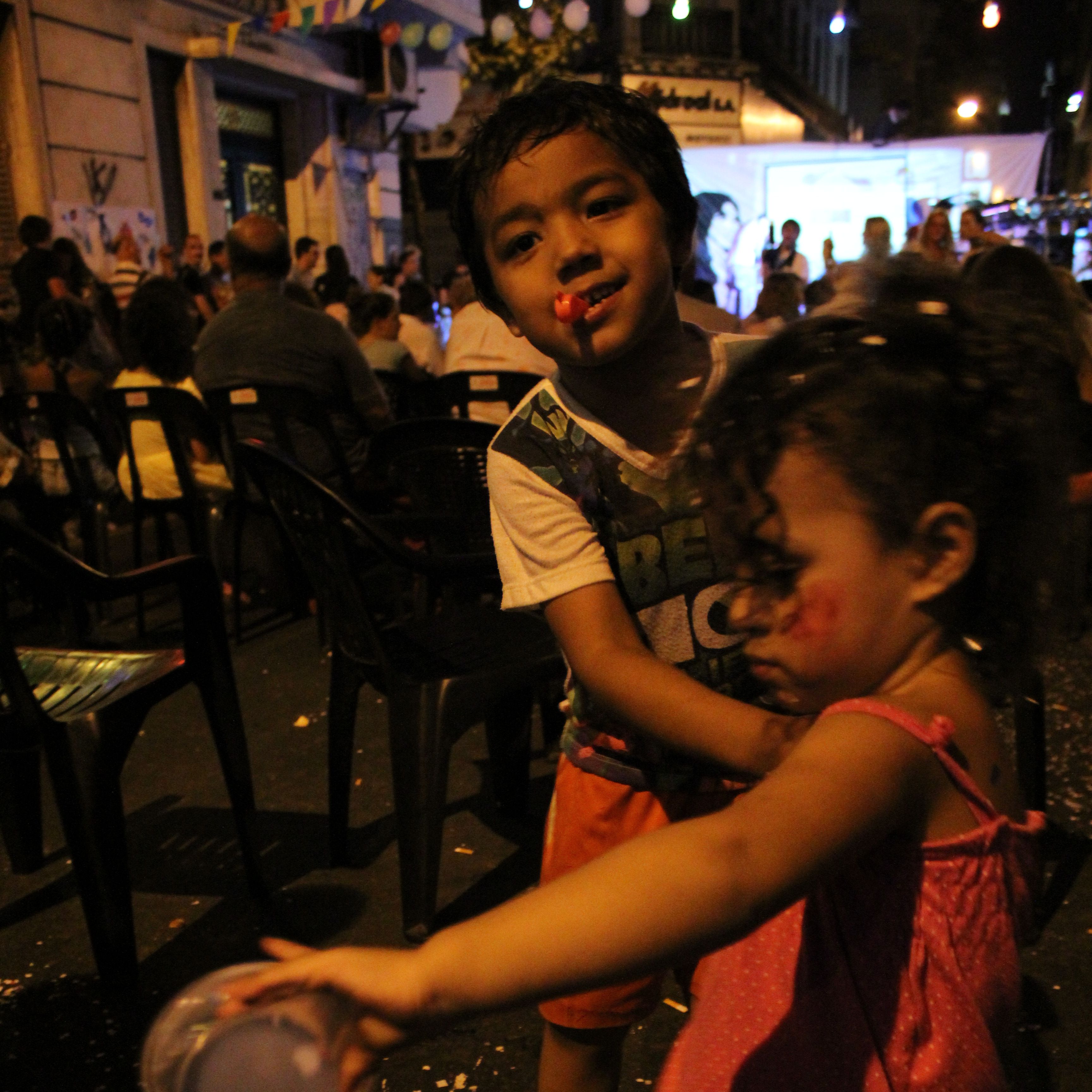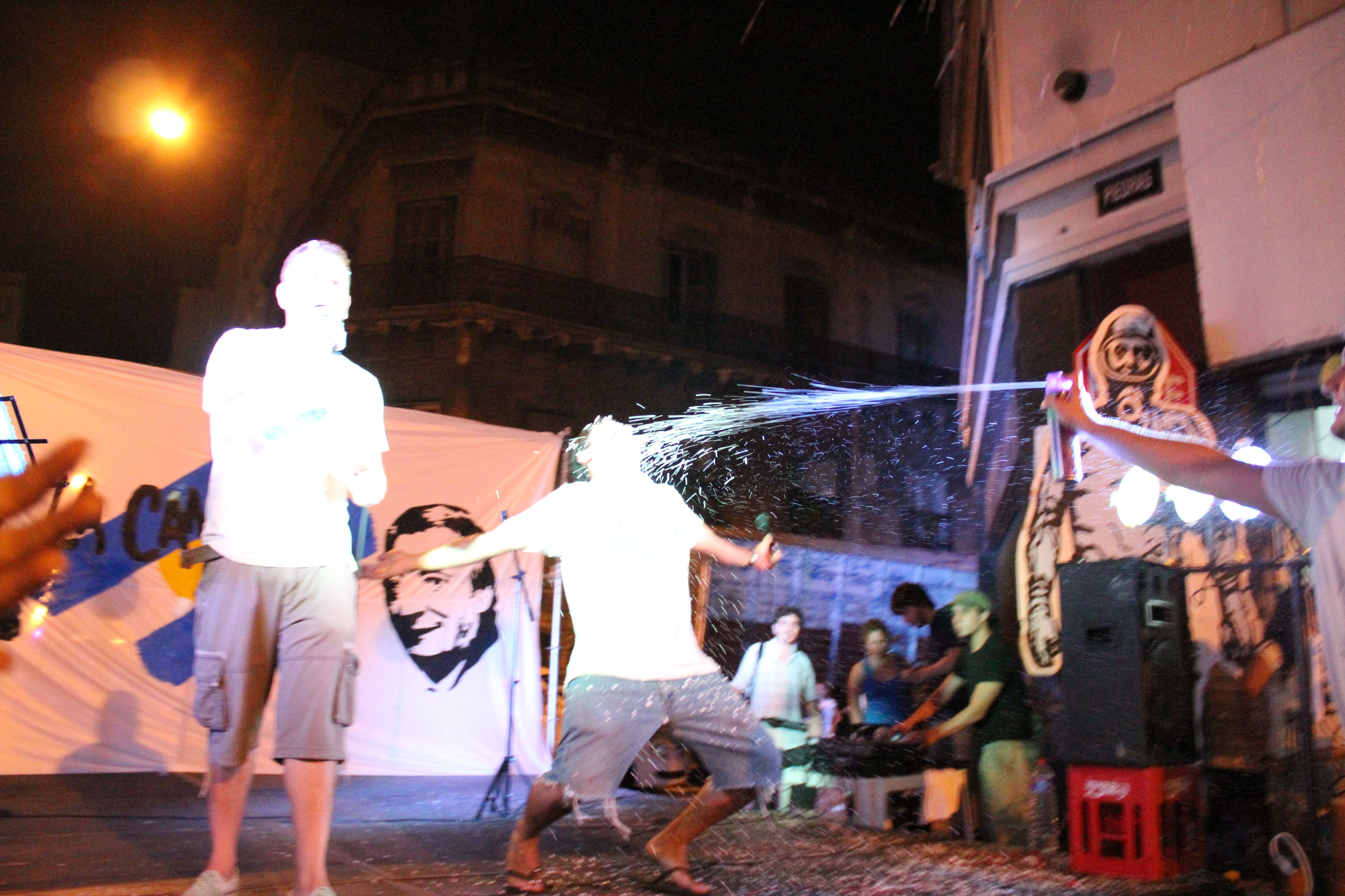 De la espuma y del papel picado no pudo eludirse nadie, ni los grandes ni los niños. Los que quisieron se maquillaron, se pusieron las máscaras típicas de la fecha o se disfrazaron con coloridas corbatas. Los más chicos jugaron incansablemente en los castillos inflables que fueron desplegados en plena cuadra y habían sido decorados para la ocasión. Al mirar al cielo se podían observar piñatas de pingí¼inos hechas a mano por los militantes, una línea de tiempo fotográfica que recorría distintos festejos de carnaval a lo largo de la historia y, en los banderines callejeros, irradiaba el rostro de la compañera coraje iluminada por numerosas luces multicolores.