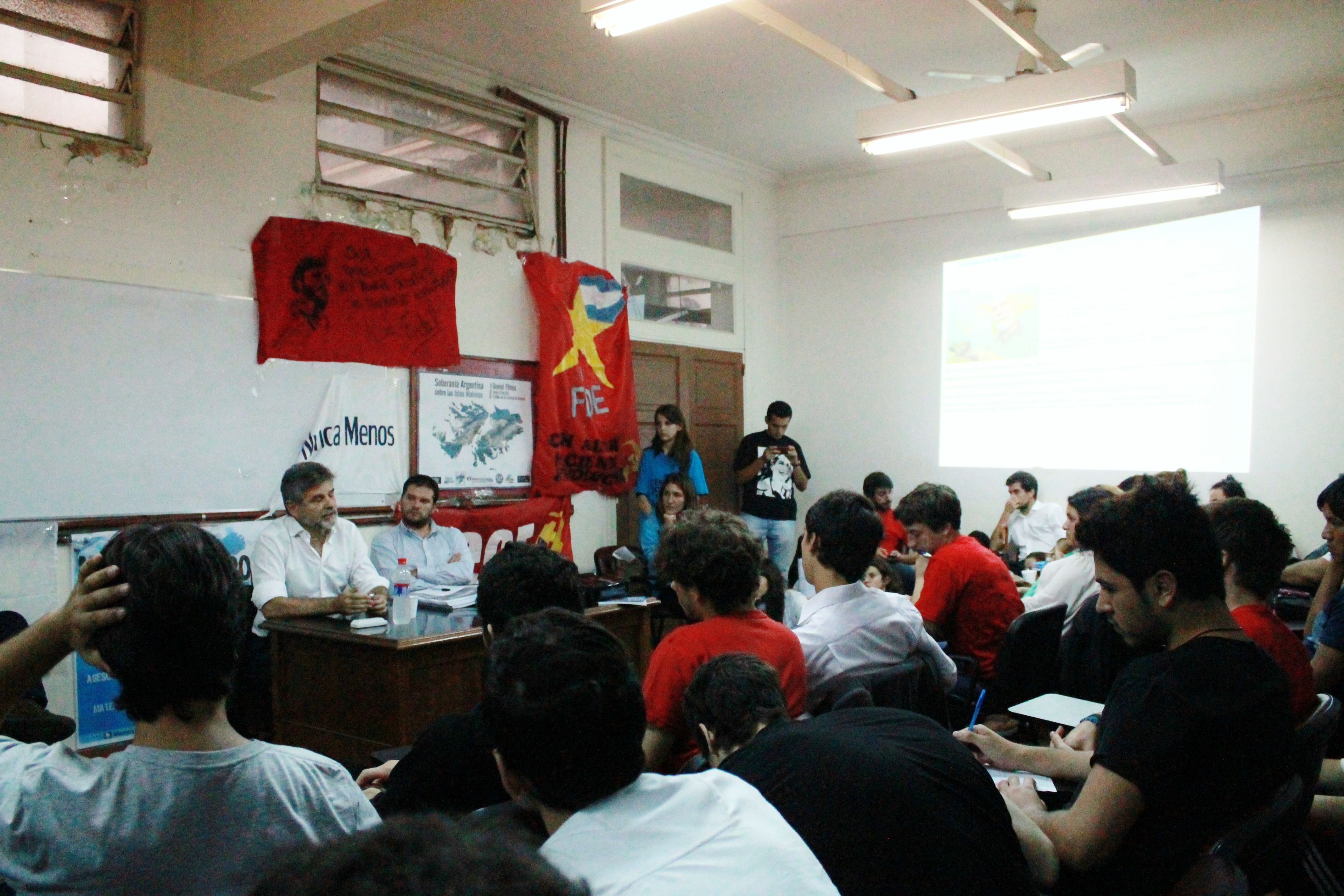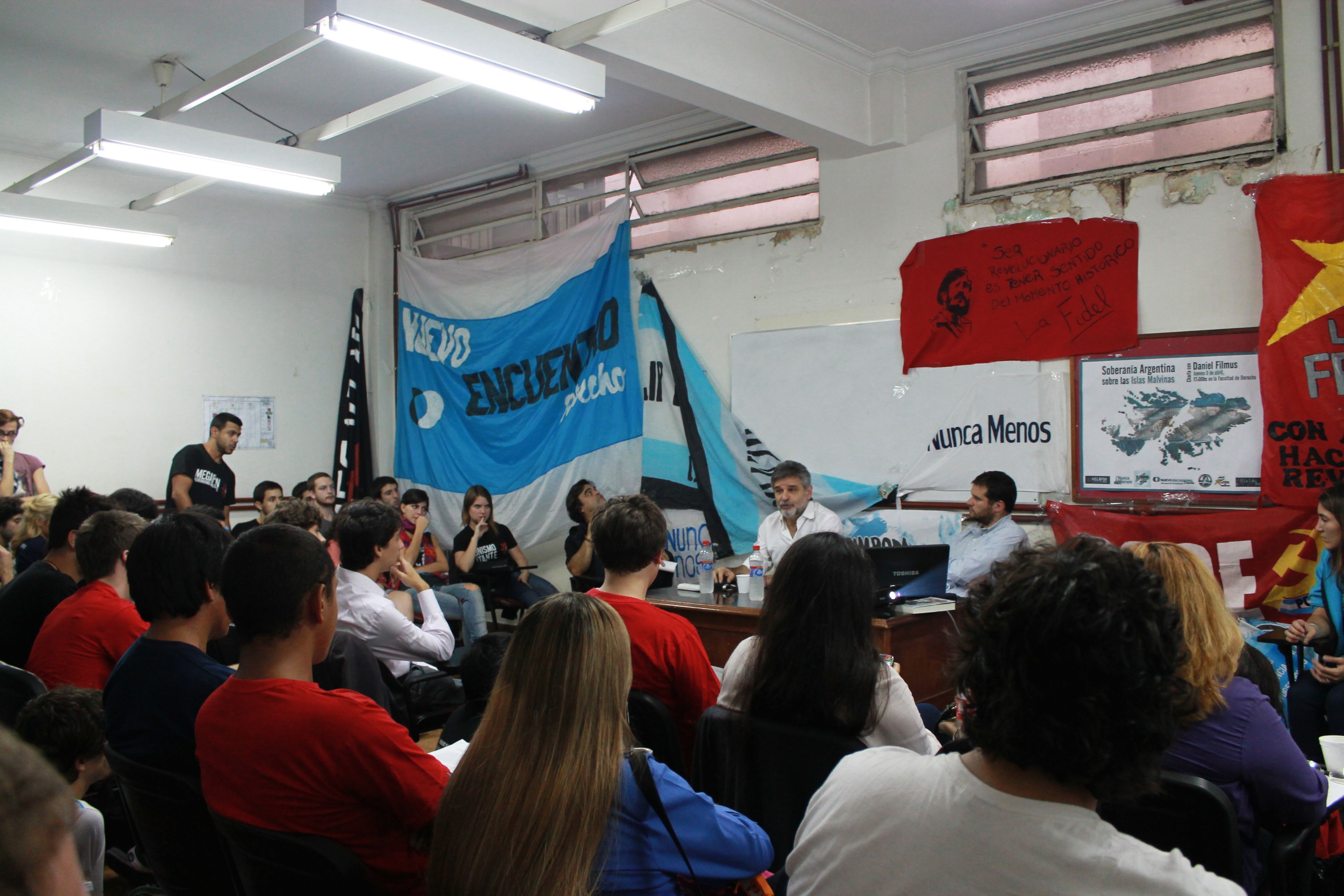 El jueves 3 de abril, el frente Unidos y Organizados de la Facultad de Derecho (UBA) llevó adelante la actividad “Malvinas: el camino a la soberaníaˮ, en conmemoración por los 32 años de la Guerra de 1982. Daniel Filmus, Secretario de Asuntos Relativos a las Islas Malvinas, expuso junto a Federico Bernal sobre los argumentos legales que avalan nuestra posición y los ámbitos internacionales para resolverlo. Resaltaron que fue Juan Domingo Perón quien propuso que la cuestión de Malvinas se estudiara en las escuelas y recordaron que de la mano de la presidenta Cristina Fernández de Kirchner, el reclamo por la soberanía se volvió a discutir por los canales institucionales. La Cámpora Derecho participó de la actividad que se desarrolló en un aula colmada por más de 50 jóvenes.