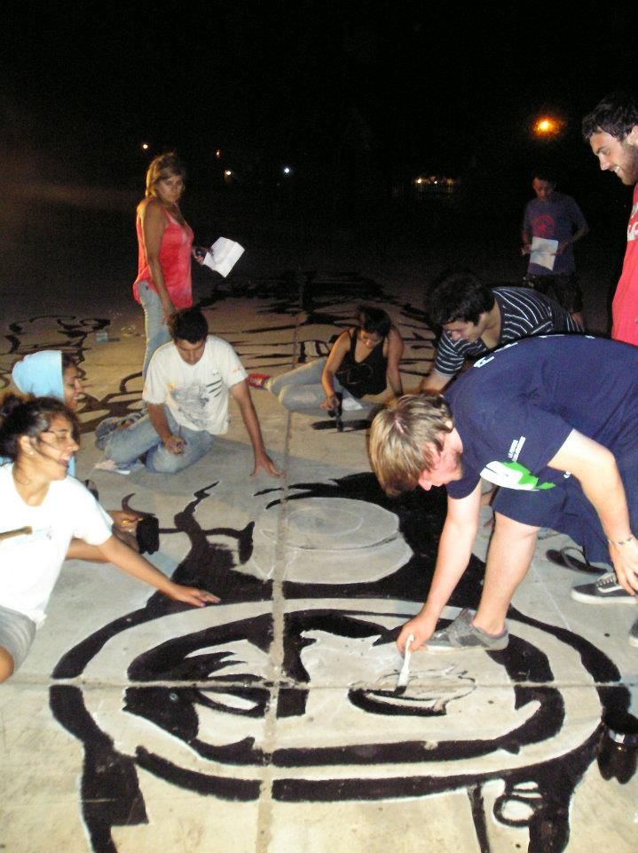 Una vez terminado el dibujo de la misma, se dedicaron a plasmar la obra en el suelo para pintarla posteriormente. El caer de la noche y la escasez de luz, no fueron un impedimento para los compañeros, que no detendrían por nada la pintada.