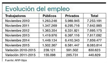 Empecemos por la más repetida de las mentiras: que no se creó empleo en los últimos cinco años. Basta con tomar la cifra de crecimiento publicada por el propio INDEC de Macri-Todesca el 30 de marzo pasado, una de las pocas que publicó saltando el apagón estadístico. Según el INDEC el PIB de Argentina creció 2,1 por ciento en 2015, y también creció en los tres años anteriores: 0,8 por ciento, 2,9 por ciento y 0,5 por ciento. Si preferimos tomar los datos de crecimiento de la oficina de estadísticas de la Ciudad de Buenos Aires, los resultados son muy similares ya que en 2015 arrojan un crecimiento del 2,7 por ciento. Como es de esperar, los números de empleo reflejan la misma evolución. Utilicemos una fuente que no está cuestionada, la base de AFIP (el SIPA) que registra la cantidad de personas empleadas según la cantidad de aportes a la seguridad social que efectivamente se realizan. Como muestra el cuadro, el empleo registrado creció entre 2010 y 2015 todos los años, y de punta a punta en más de 830.000 personas. De modo que el empleo total, formal e informal, lo hizo aún en mayor medida. Nótese además que 2/3 del crecimiento está explicado por el empleo privado, de manera que la última declaración de Macri, realizada tristemente en el Día del Trabajo, es simplemente un bolazo cósmico: “Hace cinco años que no se genera empleo, porque ocultaron el desempleo con trabajo público inútilˮ. En los últimos cinco años creció el empleo total, el empleo público y el empleo privado.