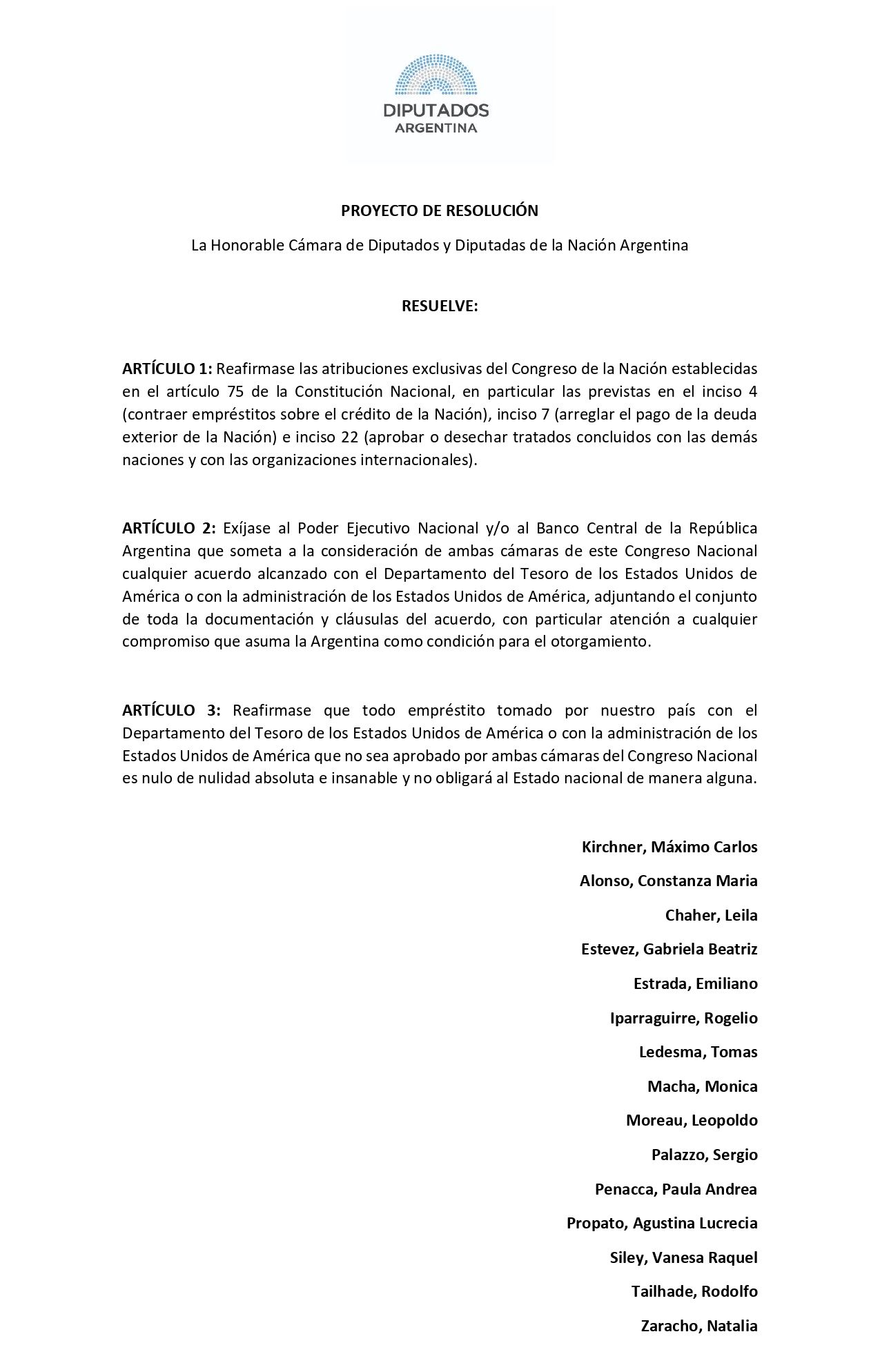 “La suscripción de un acuerdo financiero con el Tesoro de los Estados Unidos, sin la aprobación del Congreso de la Nación, viola de manera flagrante las disposiciones constitucionales que reservan al Poder Legislativo la potestad exclusiva sobre el endeudamiento público y los tratados internacionales”, señala el proyecto presentado por Máximo la semana pasada. En efecto, según el artículo 75 de la Constitución Nacional, corresponde al Congreso de la Nación contraer empréstitos sobre el crédito de la Nación (inciso 4), arreglar el pago de la deuda exterior de la Nación (inciso 7) y aprobar o desechar tratados concluidos con las demás naciones y con las organizaciones internacionales (inciso 22).