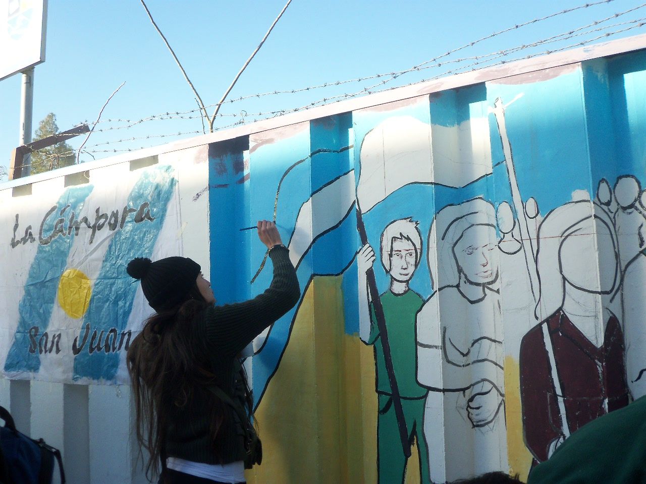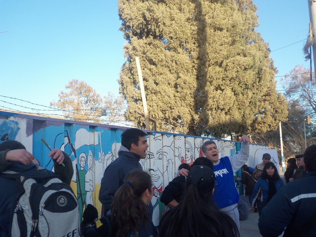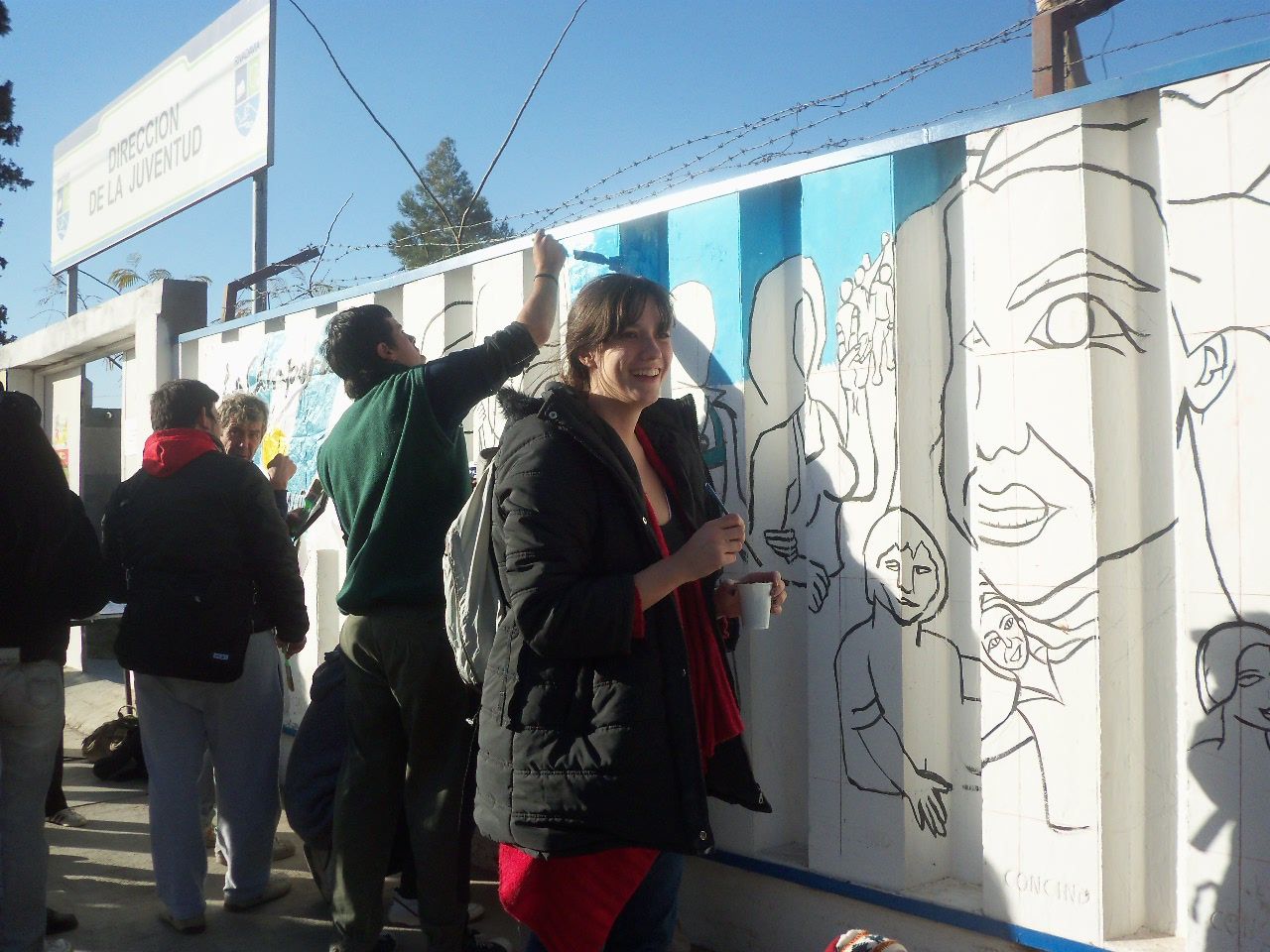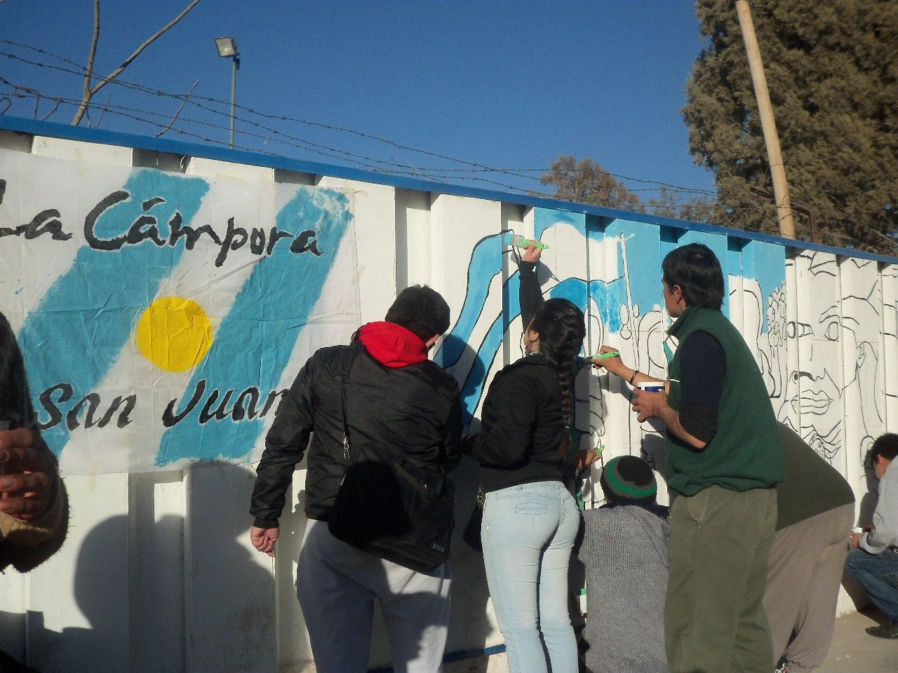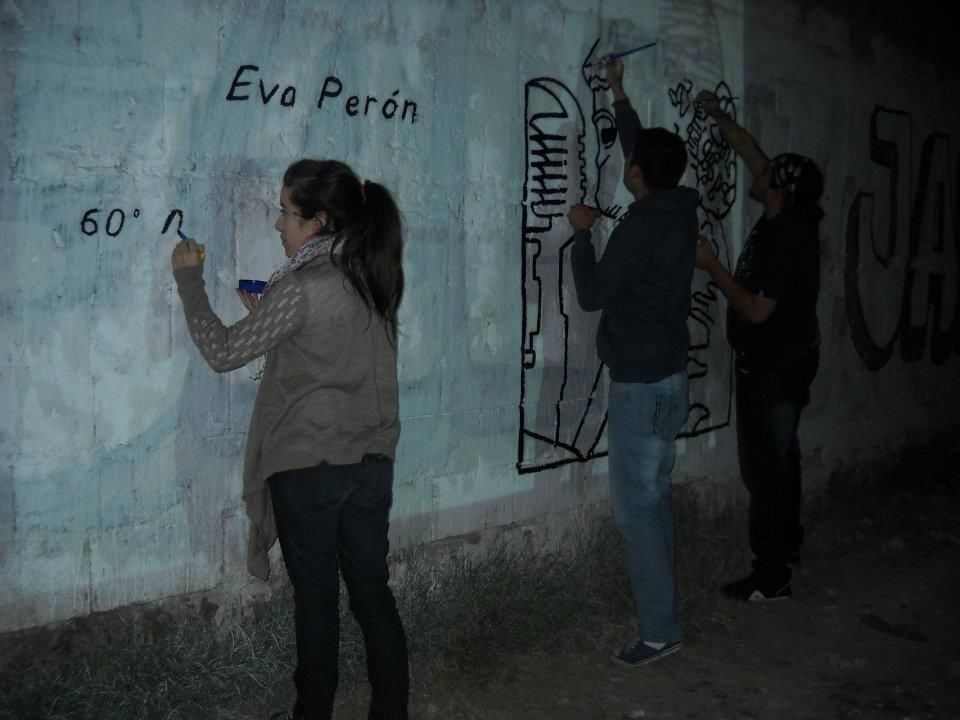 Los jóvenes comenzaron la actividad alrededor de las dos de la tarde, a pesar del frío viento sur, que soplaba sin cesar. Comenzaron a llegar abrigados, con juegos de mate en la mochila, algunos con tortitas, también galletitas y no faltó el bizcochuelo, para acompañar la larga tarde, ya que el motivo del encuentro era más que movilizante, nadie faltó a la cita. Algunos preparaban los colores, mientras otros, los más conocedores de la técnica, comenzaban a trazar el mural, para después sumar a unos 40 jóvenes que colaboraron entusiastas pintando y dando color a esa pared que después vería reflejado el hermoso mural colectivo con la imagen de Evita y las principales medidas político y sociales que impulsó en su época.
