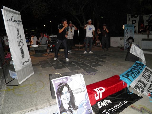 Alrededor de las 18 hs las banderas de las diferentes agrupaciones compañeras que fueron invitadas a participar del evento decoraban el escenario: JP Decamisados; JP Evita, Peronismo 26 de Julio; Oktubres; HIJOS y La Cátedra Abierta de Derechos Humanos.