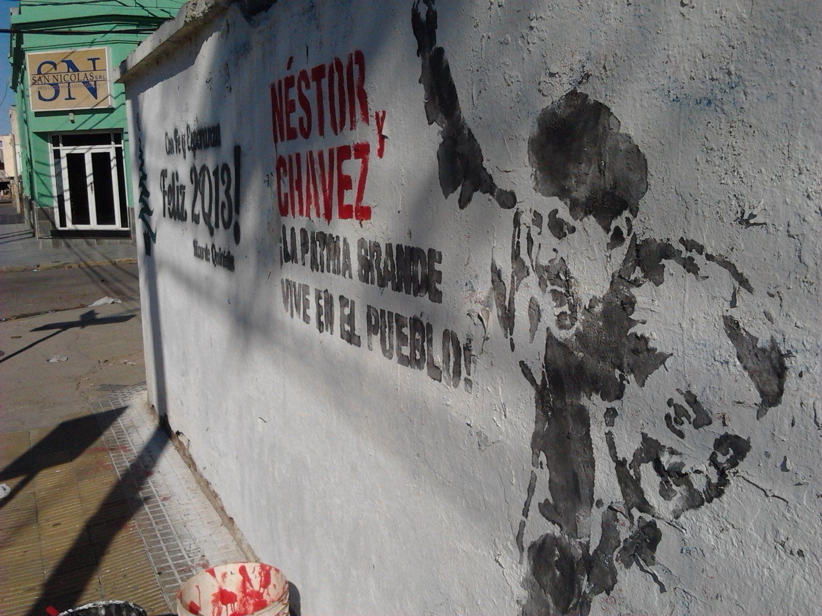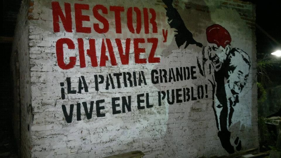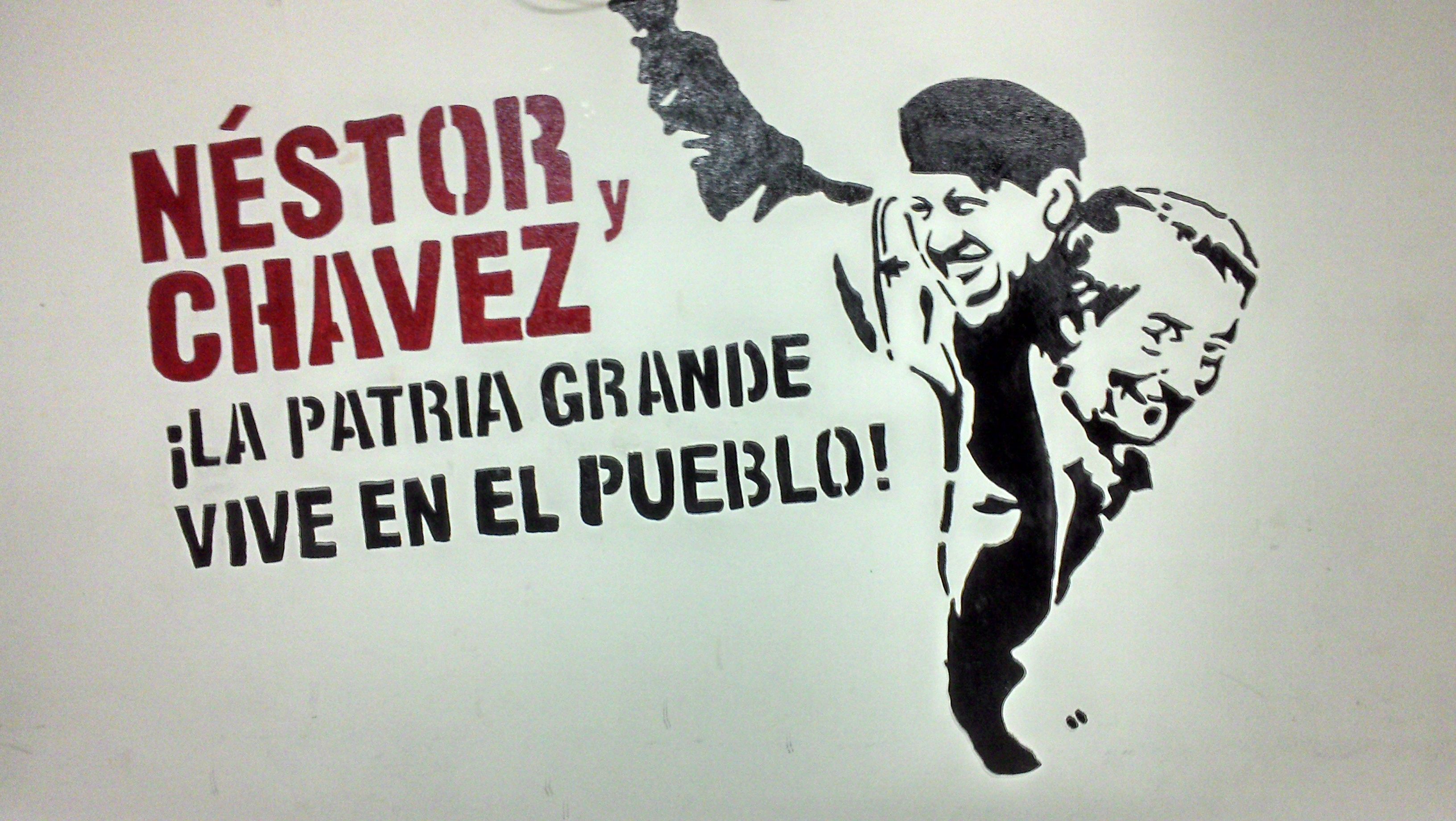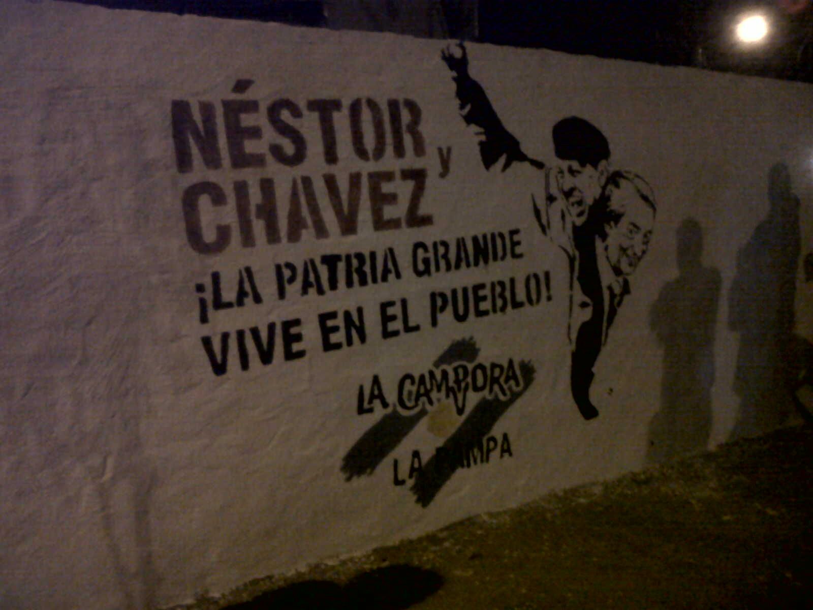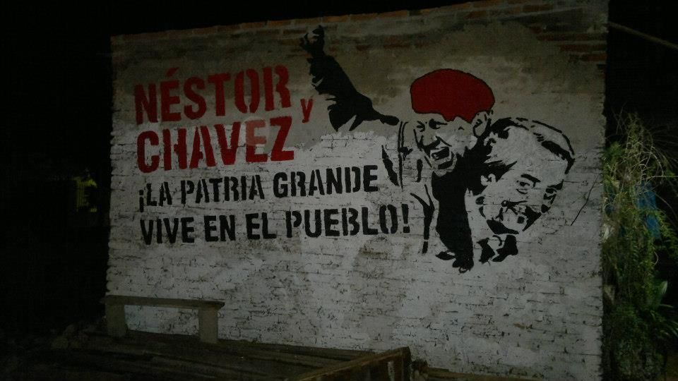 Comandante Hugo Chávez, al líder latinoamericano, al gran compañero. En todo el país se realizaron murales con las imágenes de Néstor y de Chávez y la frase ¡La Patria Grande vive en el pueblo!