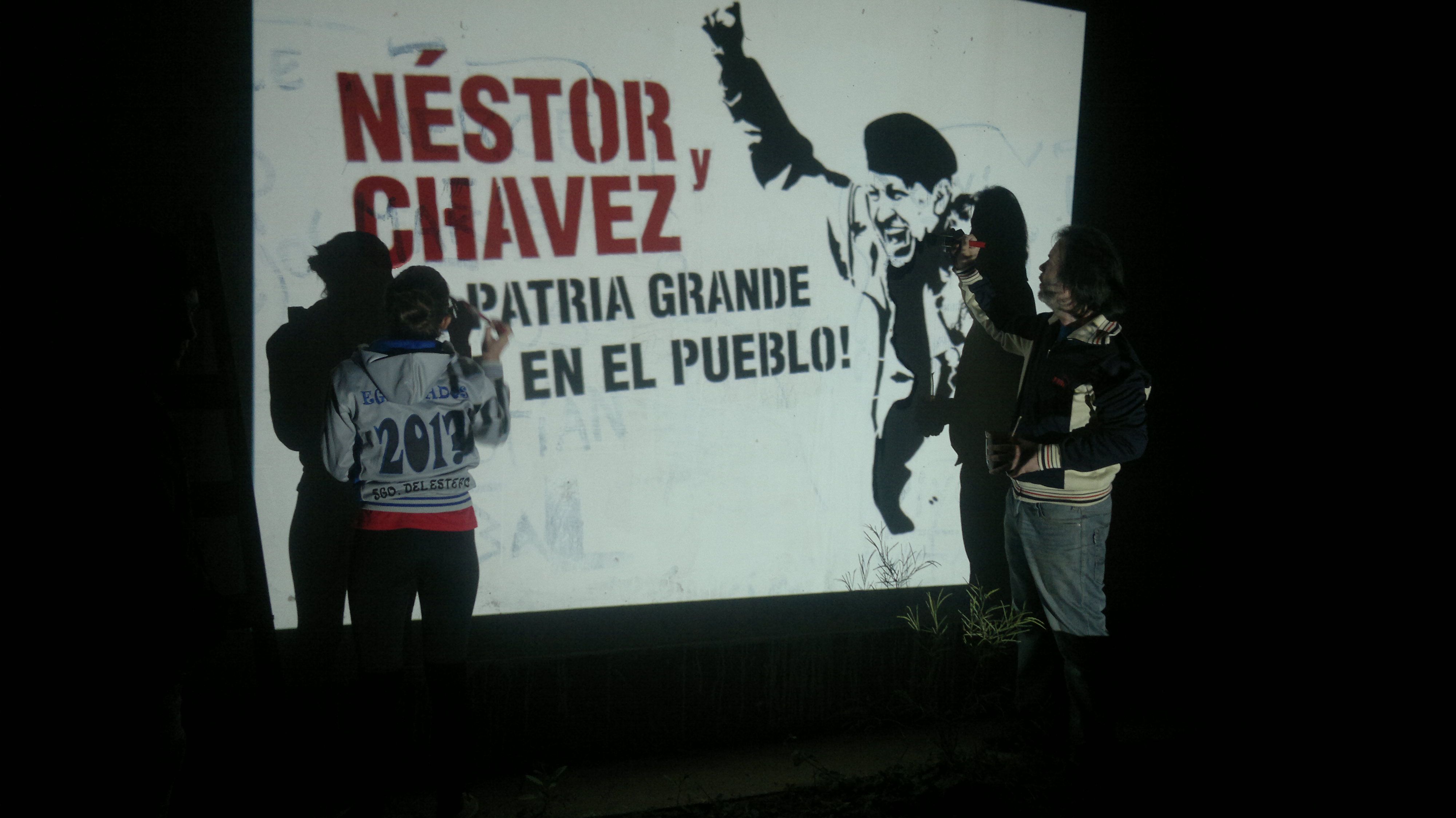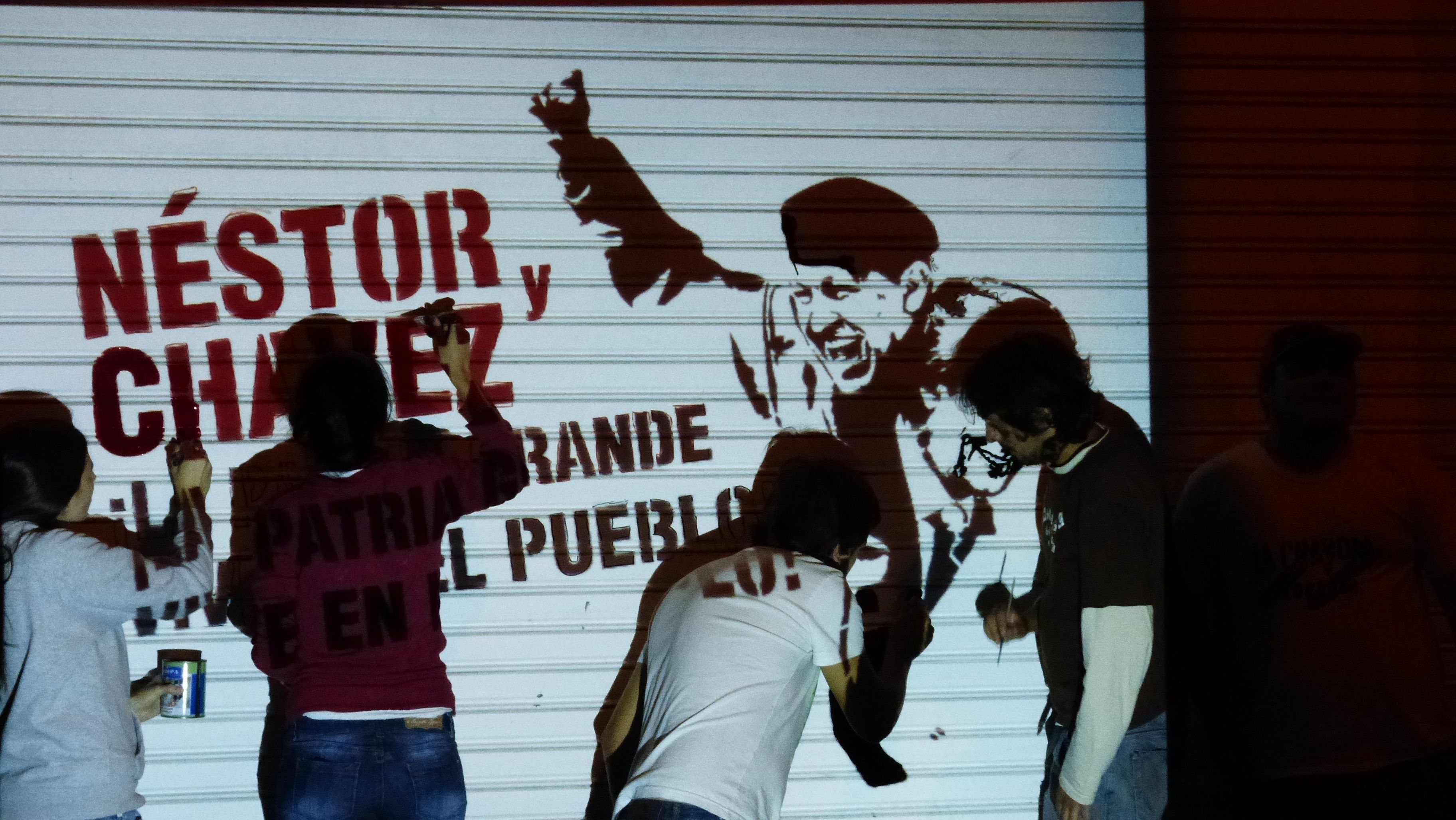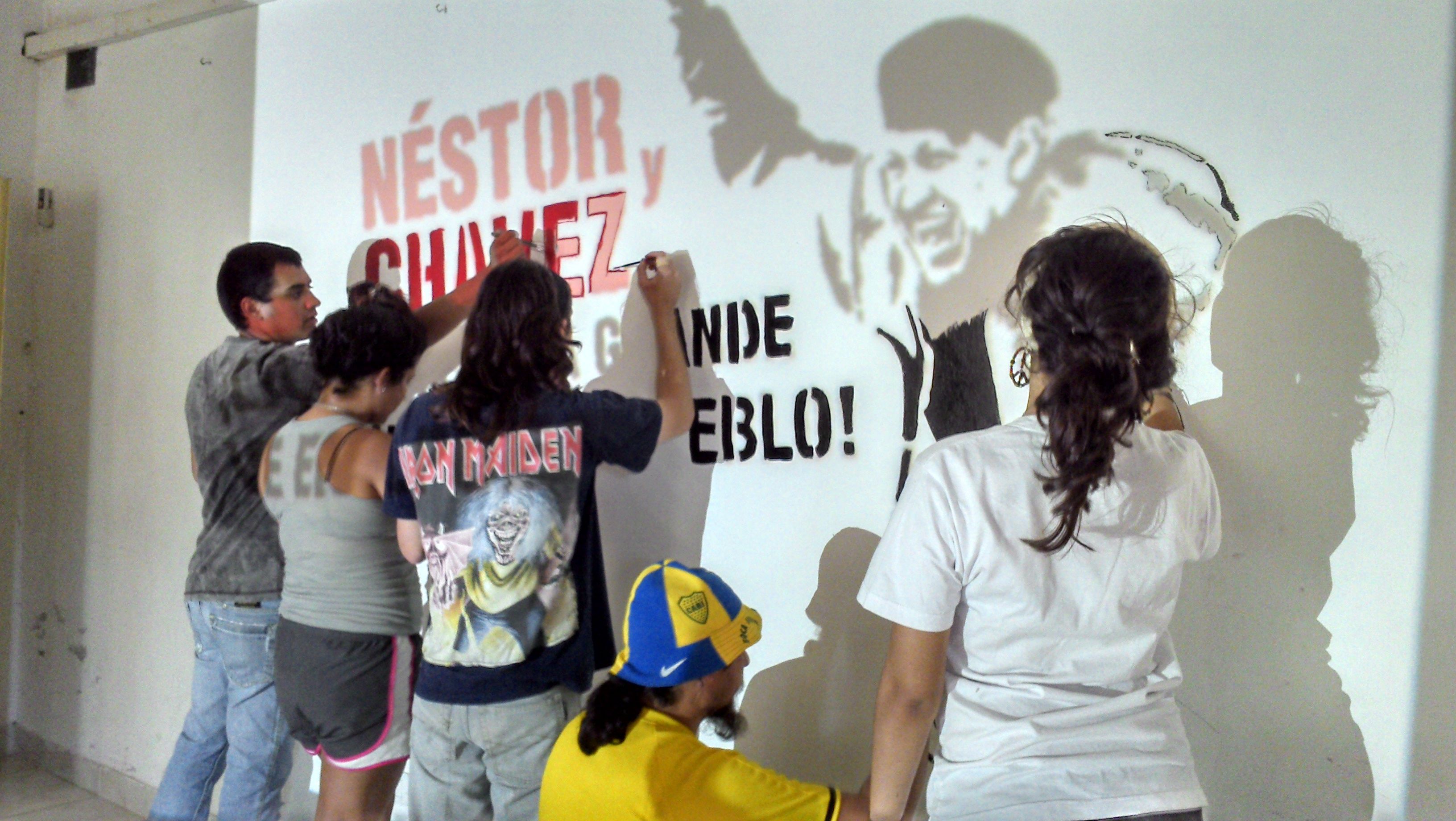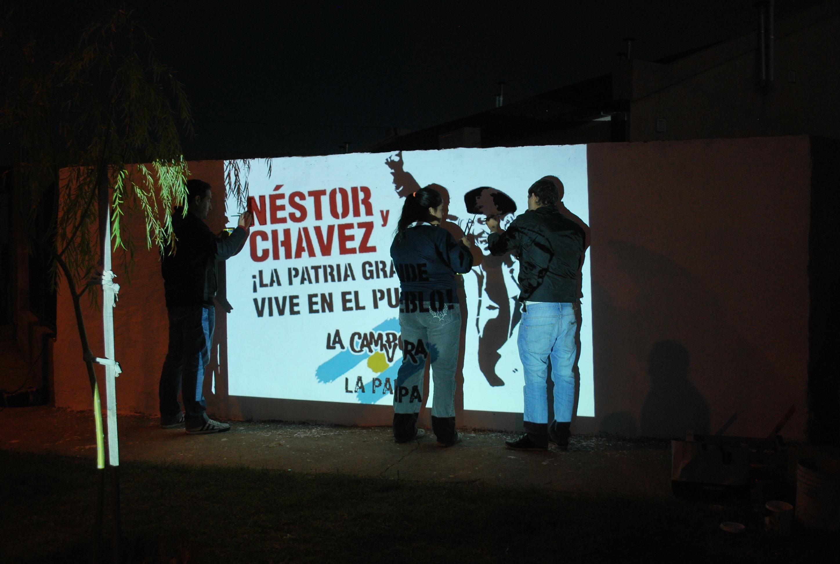Comandante Hugo Chávez, al líder latinoamericano, al gran compañero. En todo el país se realizaron murales con las imágenes de Néstor y de Chávez y la frase ¡La Patria Grande vive en el pueblo!