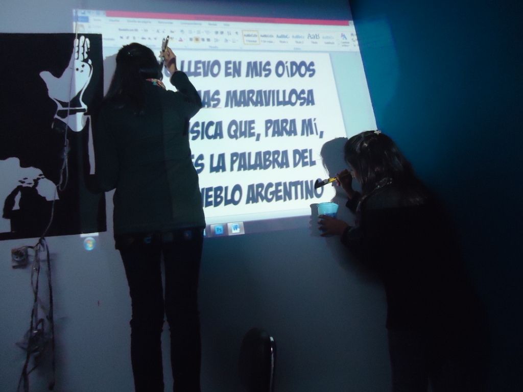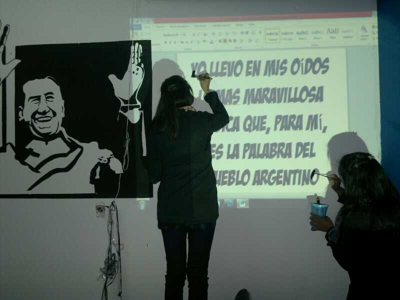En el mural, realizado con proyector, se ve reflejado el rostro de Perón y la frase que dedicó en nuestra Plaza de Mayo, en una anticipada despedida, el 12 de junio de 1974: “Llevo en mis oídos la más maravillosa música que, para mí, es la palabra del pueblo argentinoˮ.