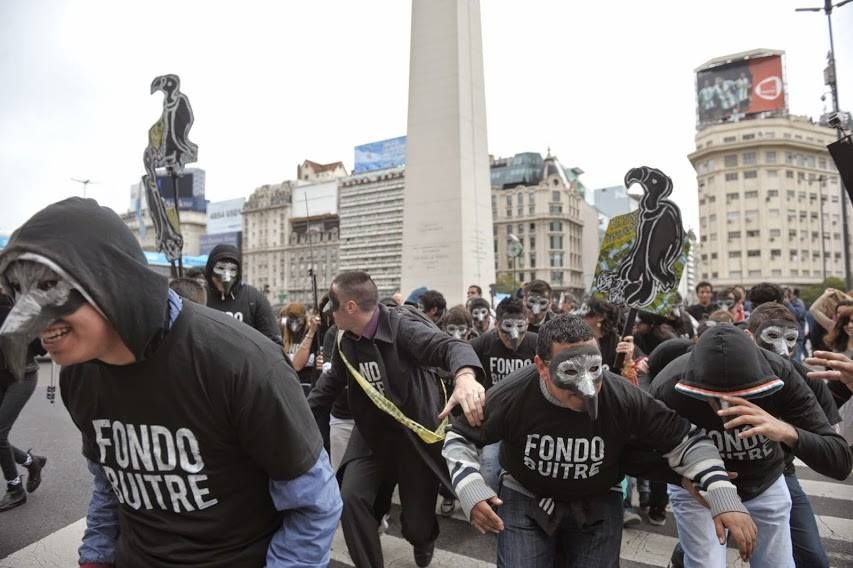 Caracterizados como buitres, vestidos de negro y con máscaras, los militantes cercaron el monumento bajo las órdenes Griesa, pegando carteles de embargo en las rejas del mismo, que notificaban que “por requerimiento de los abogados representantes de los fondos buitre se procede a embargar el obelisco porteño a efectos de acumular bienes para su eventual remateˮ.