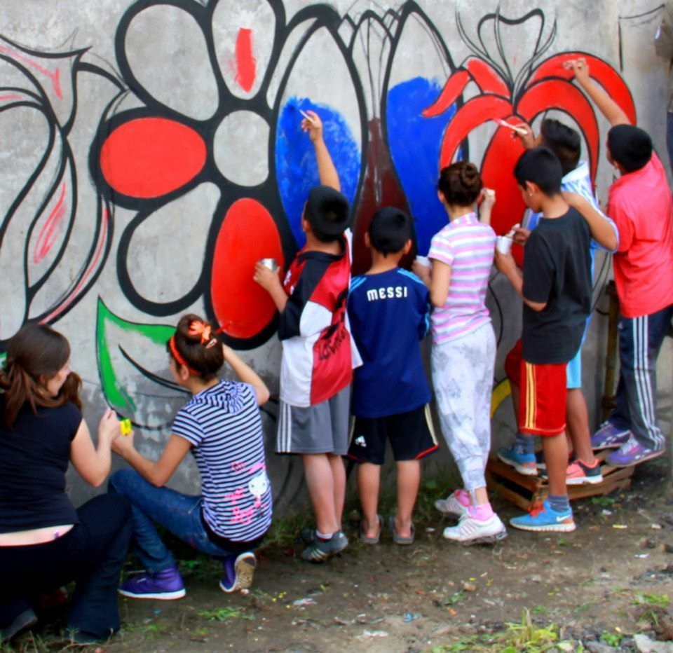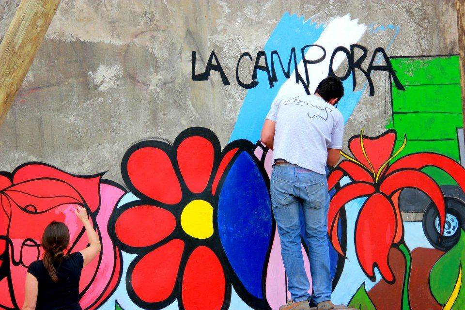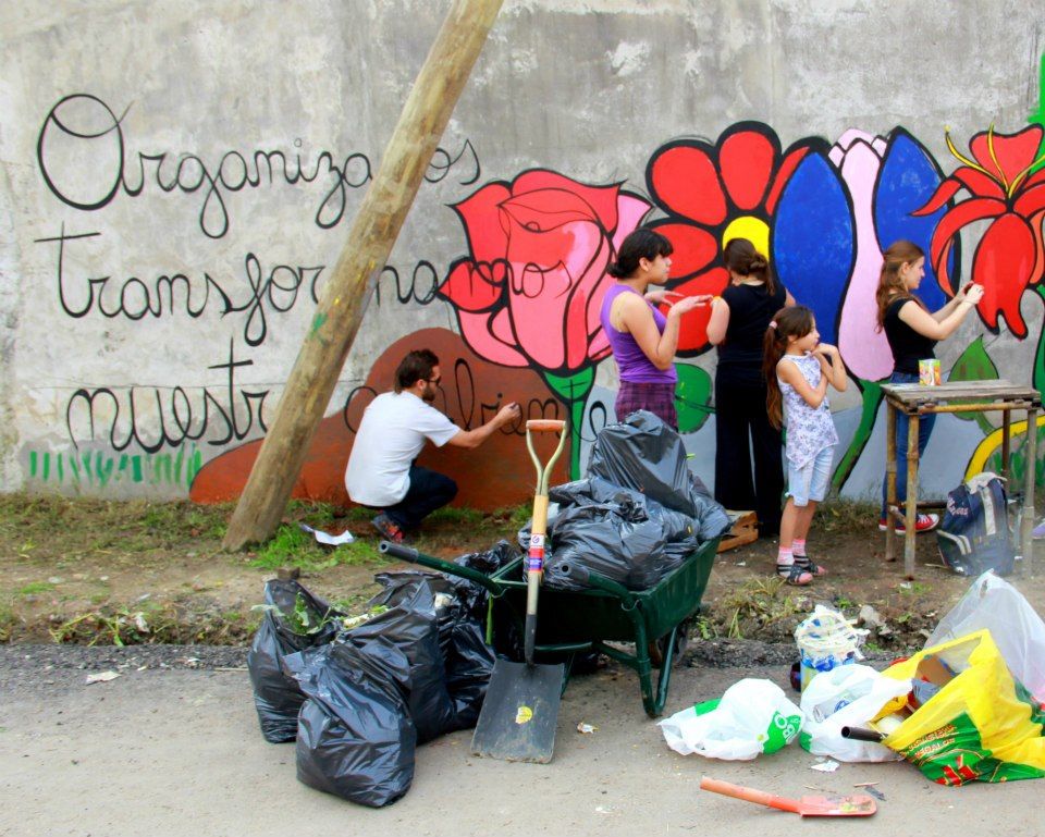 jornada de mejoramiento del espacio público. Luego de charlar y organizarse con los vecinos, se acordó que se dejara registro plástico en una de las paredes del lugar sobre los trabajos realizados para mejorar el barrio. Durante la jornada, se compartieron diversos conocimientos y se hizo hincapié acerca de la importancia del cuidado de medioambiente y la clasificación y reciclaje de residuos.