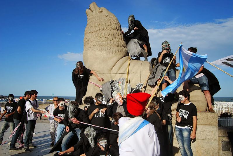 Los compañeros caracterizados como buitres, recorrieron la peatonal de la ciudad, mientras que repartían volantes donde se explicaba la situación de la Argentina y los fondos buitres y conversaban con la gente que se encontraba allí, quienes recibían con alegría los volantes y disfrutaba de la intervención. Luego de varias cuadras, llegaron a la rambla de la ciudad y simularon el embargo del lobo marino bajo las órdenes del juez Griesa. Los fondos buitre quisieron quedarse también con ese ícono de la ciudad. Pero minutos más tarde, otros compañeros bailaron al ritmo de danzas típicas argentinas, enfrentando a los fondos buitres y evitando así el embargo del lobo. Mientras tanto, la bandera de nuestro país flameaba. Los compañeros, mediante la intervención artística, demostraron que la soberanía del país es innegociable y que nadie podrá arrebatarnos nuestros símbolos, nuestras conquistas como Pueblo argentino, nuestros derechos y nuestros sueños, siempre apoyando a Cristina Fernández de Krichner, quien todos los días demuestra su compromiso con la Patria y con todos los argentinos.