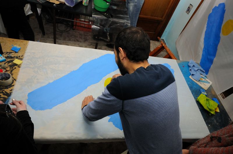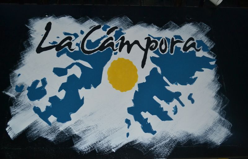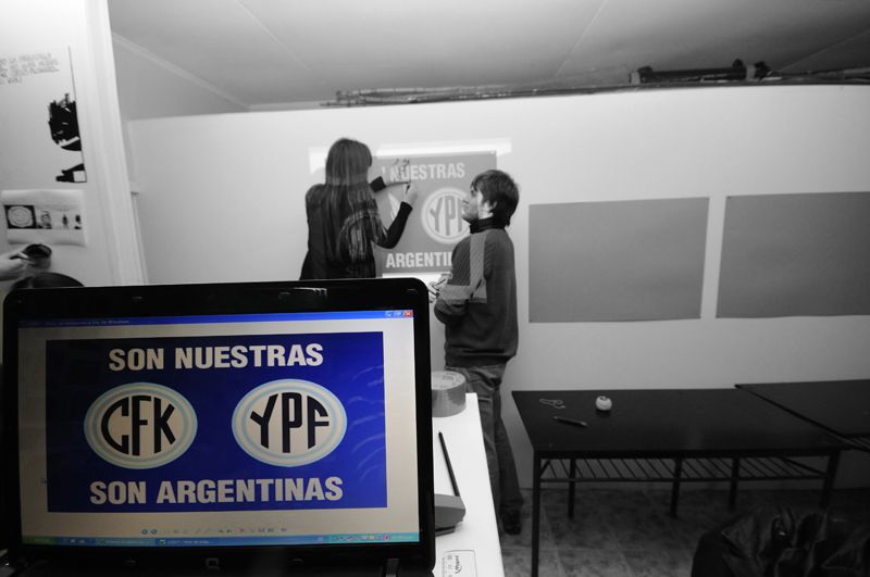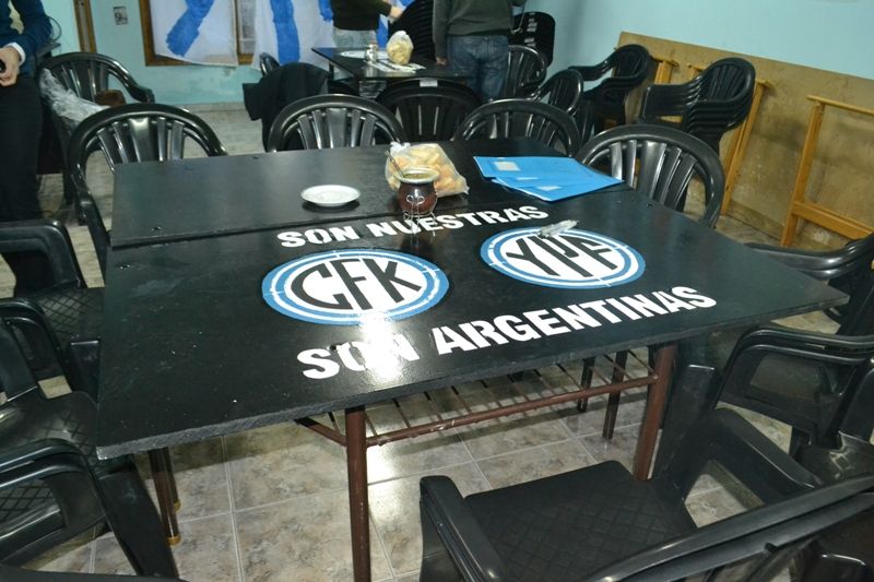 Entre cartones, trinchetas y las manos de los más audaces, se cortaron los esténcil que permitieron identificar a las mesas con los isologotipos de “Malvinas Argentinas 30 Añosˮ, “La Cámporaˮ, “YPF y CFK son Argentinasˮ, “Recuperamos YPFˮ, y las figuras de Néstor y Cristina en esas imágenes que llegan de lleno al corazón. No faltaron para el caso, y como es habitual en estas tareas, las esponjitas, los colores celeste y blanco y dedos manchados al por mayor.