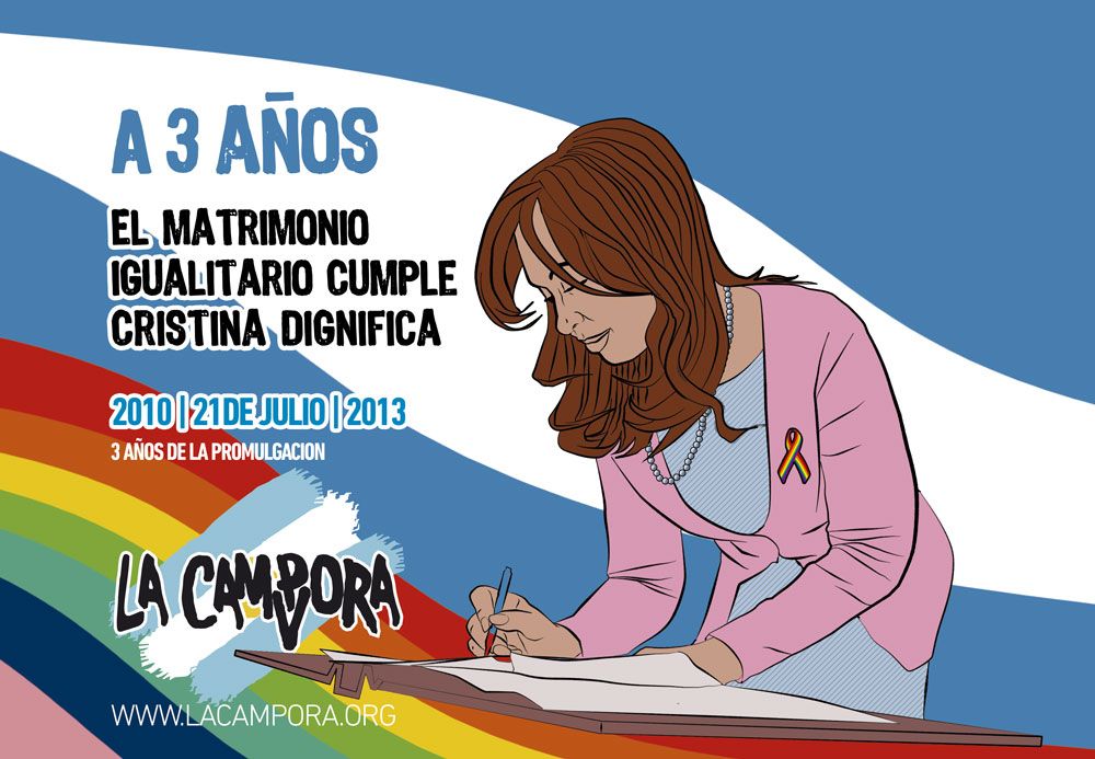 “El matrimonio igualitario cumple, Cristina dignificaˮ. En el tercer Aniversario de la promulgación de la ley de matrimonio igualitario, por parte de nuestra Jefa en el Salón de los Patriotas de la Casa Rosada, el 21 de julio de 2010, La Cámpora Diversia organizó en su unidad básica de la Capital Federal, el segundo Plenario Federal para compartir las experiencias de cada territorio y desarrollar estrategias de militancia. Como así también aunar criterios para el tratamiento de todos los temas de diversidad.