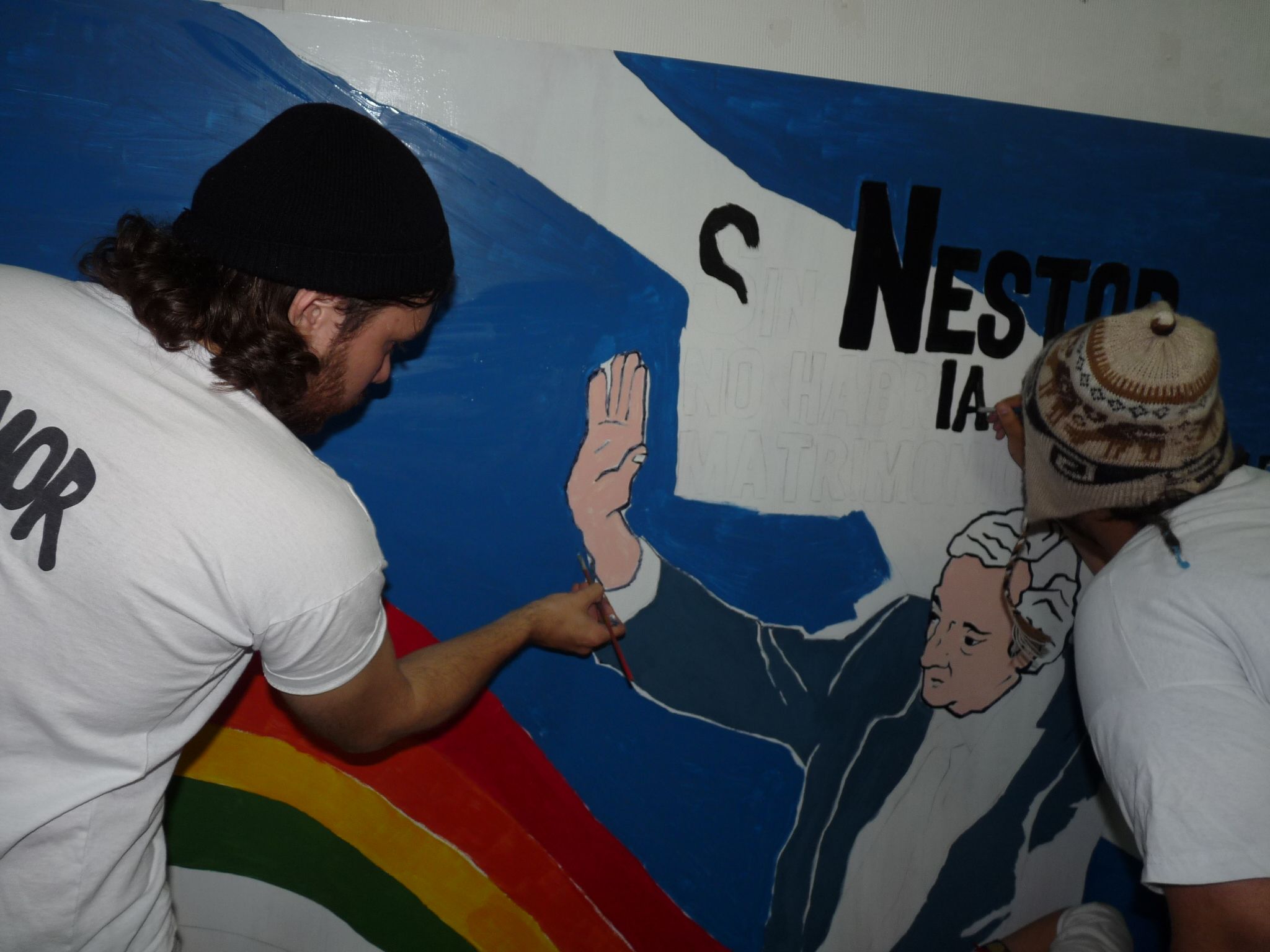 La jornada comenzó con las primeras horas de la tarde, el sol brillaba mientras que los militantes comenzaban a pintar un mural que captaría el momento en que Néstor levanta la mano, de la que sería la única ley que llegó a votar cómo diputado.